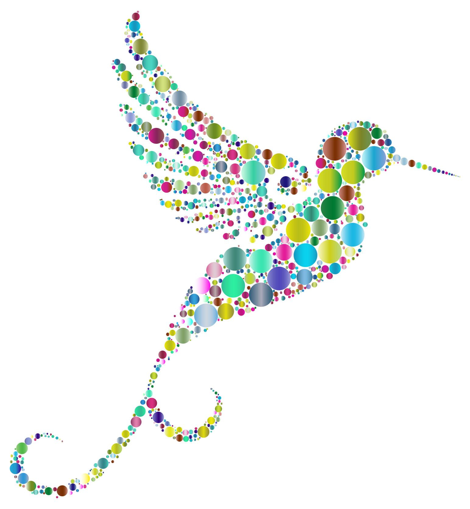 This features a colorful hummingbird silhouette, which is made up of small circles that vary in size and color. These circles are arranged to create the bird's wings, body, and head, giving it an artistic and visually appealing appearance. The hummingbird is depicted from the side, allowing viewers to appreciate its intricate design and the vibrant colors of the circles that make up its form. This unique representation of a hummingbird showcases the beauty found in nature through the use of colorful shapes and patterns.