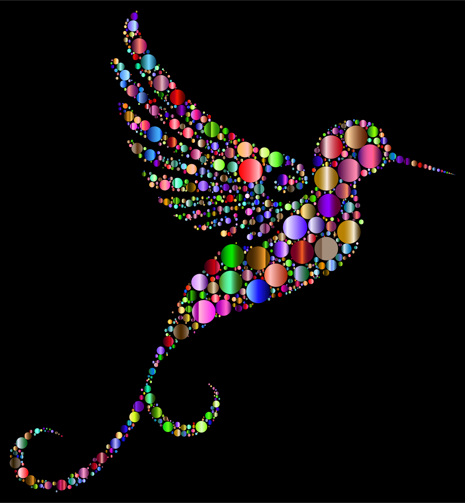This features a colorful hummingbird with a long beak, made up of various circles. These circles are scattered throughout the bird's body and wings, creating an eye-catching pattern. The hummingbird is perched on a black background, which contrasts beautifully with the vibrant colors of the circles. This artistic representation of a hummingbird showcases its unique features while adding a touch of creativity to the scene.