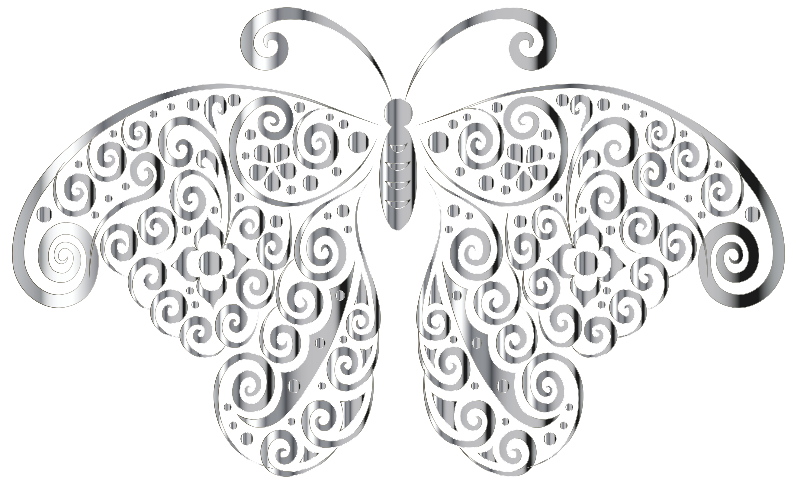This features a beautifully crafted silver butterfly with an intricate design. It is adorned with swirls and spirals, giving it a unique and elegant appearance. The butterfly's wings are spread out, showcasing the detailed patterns on its surface. This artistic piece could be used as a decorative item or even as a functional piece of jewelry. Its delicate design makes it an attractive addition to any collection or display.