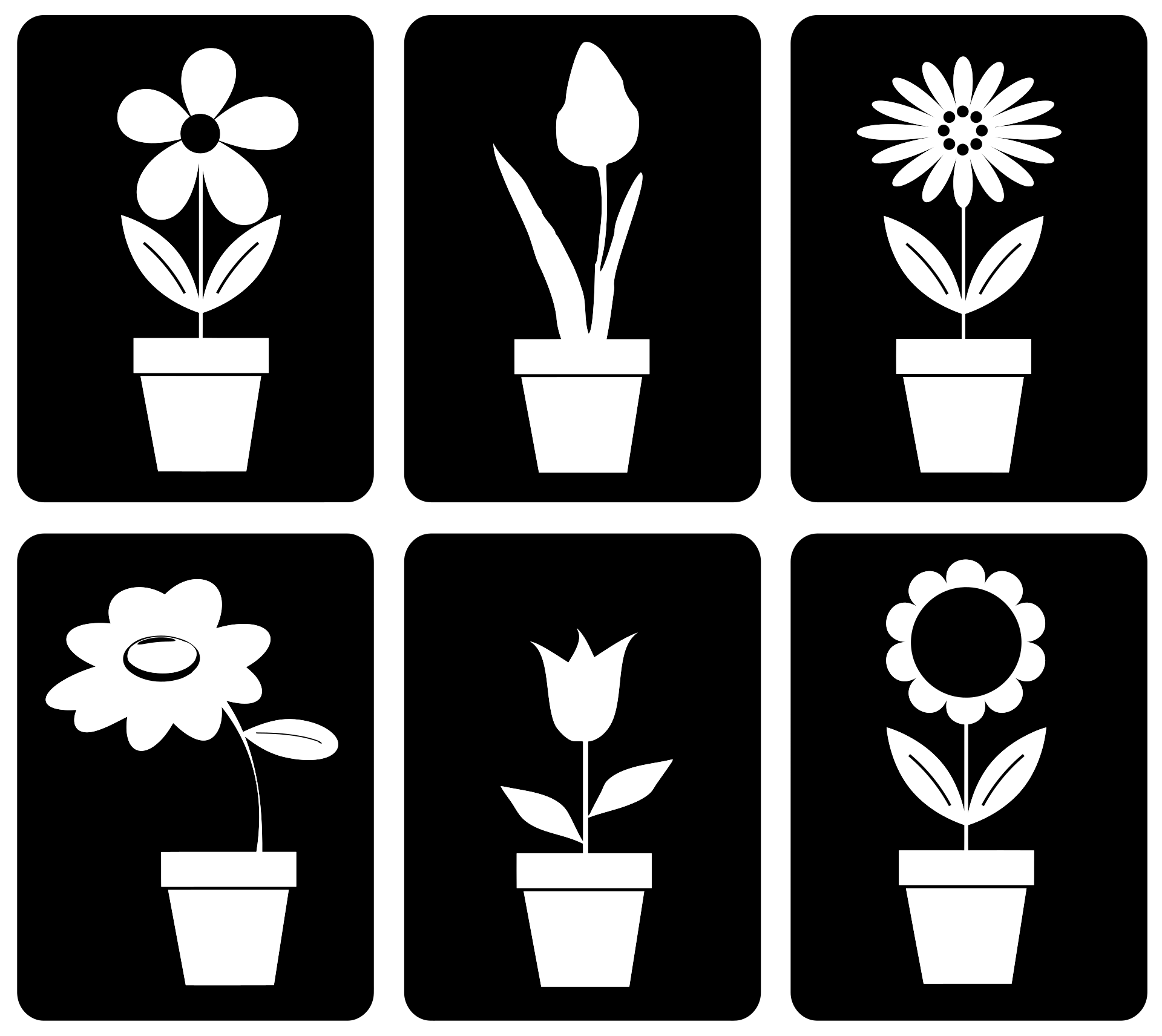 This features a collection of six different potted plants, each displayed in a black and white picture. Each plant is placed inside a pot, showcasing various types of flowers. The arrangement includes a mix of daisies, tulips, sunflowers, and other plants, creating an appealing visual display. The close-up nature of the images allows viewers to appreciate the details of each flower and pot, making it an attractive collection for anyone who enjoys gardening or plant care.