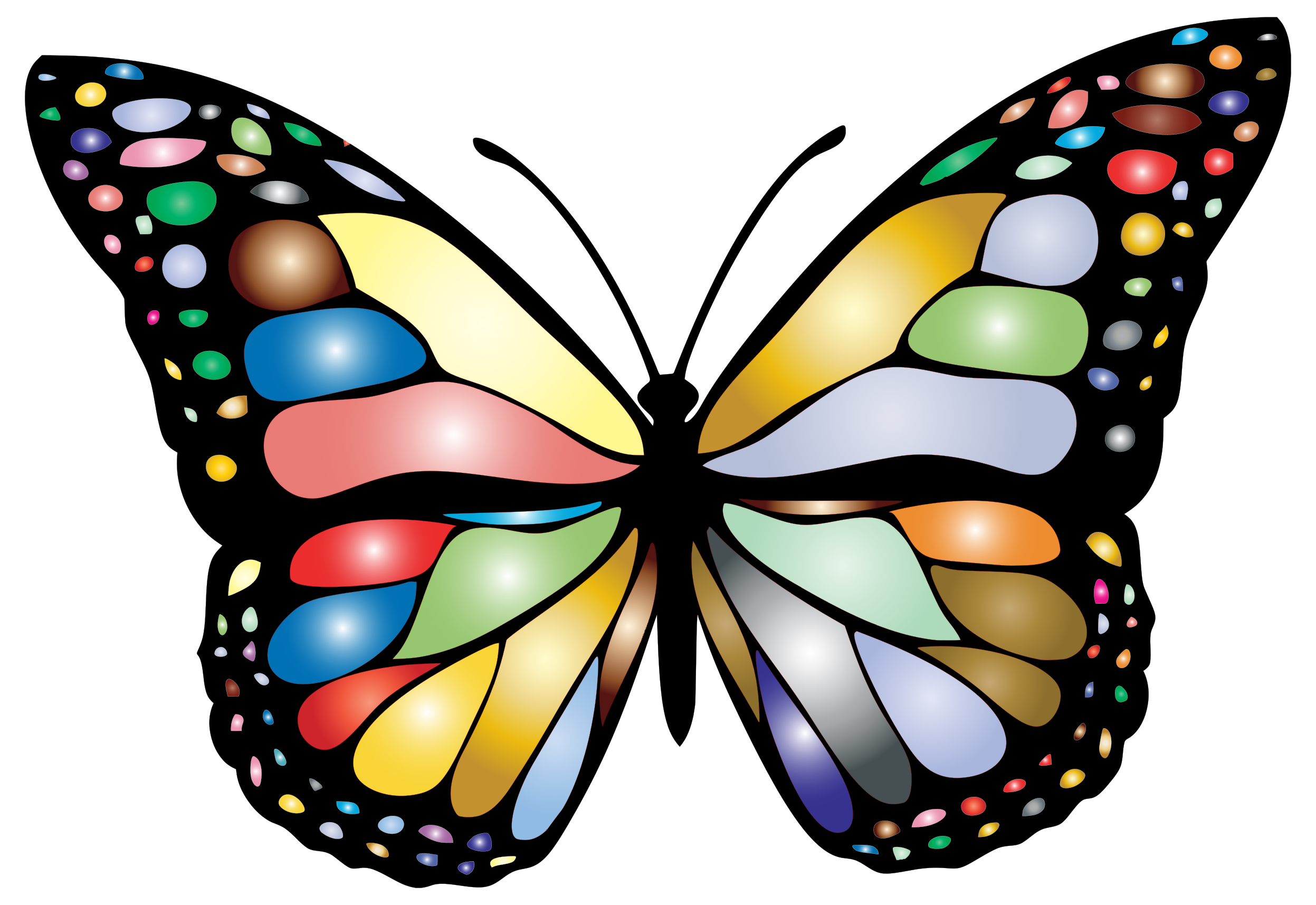 This features a large, colorful butterfly with a black body and vibrant wings. The butterfly is adorned with various colors such as yellow, green, blue, red, orange, pink, purple, and white. It appears to be a close-up of the butterfly's wing, showcasing its intricate patterns and details. The butterfly seems to be in flight or hovering above something, adding an element of motion to the scene.