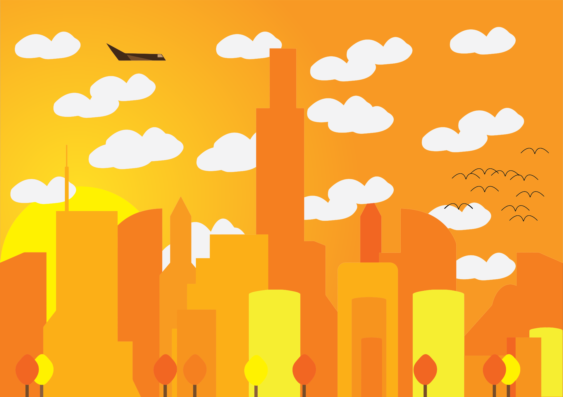 This features a cityscape with an orange sky, giving it a warm and inviting atmosphere. In the foreground, there is a large airplane flying over the city, adding to the dynamic nature of the scene. The city itself has several tall buildings, some of which are located near the water. In addition to the airplane, there are multiple birds scattered throughout the sky, with some flying closer to the ground and others higher up in the air. These birds add a sense of liveliness to the image, as they interact with their surroundings while the city continues its daily activities. The combination of the orange sky, the airplane, and the birds creates an engaging and visually appealing scene that captures the essence of urban life.