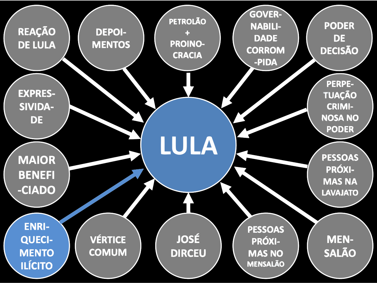 This is a diagram or flow chart that features the word "Lula" in the center. Surrounding this central point are various other words and phrases, including "reacao," "depoimento," "provao," "crime," "corrompido," "desinformado," "difamado," "pervertido," "mentir," "provar," "prova," "provao," "provao," and "provao." The chart is organized in a way that suggests it could be related to the indictment of former President Lula.