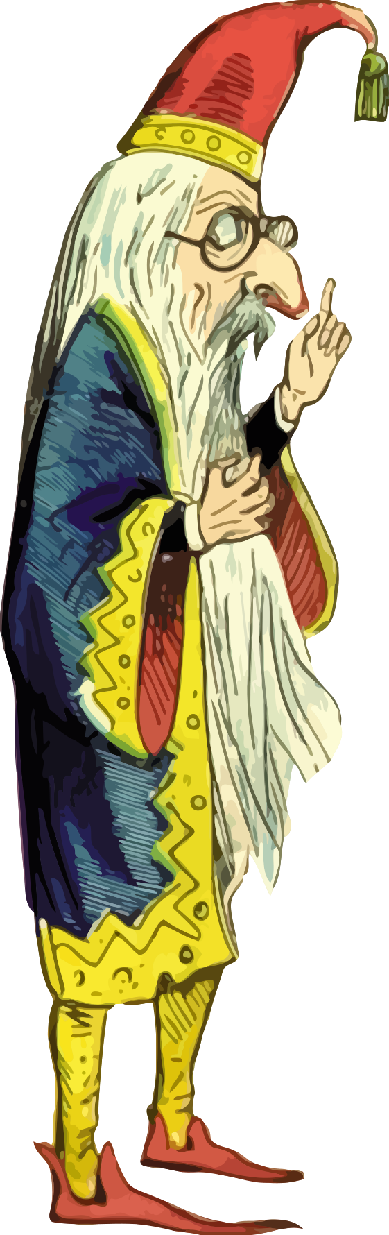 This features a colorful cartoon character, possibly an old man or wizard, wearing a red and yellow outfit. He is holding a wand in his hand while pointing at something with the other hand. The character appears to be quite unique and eye-catching, likely drawing attention due to its vibrant colors and interesting design.