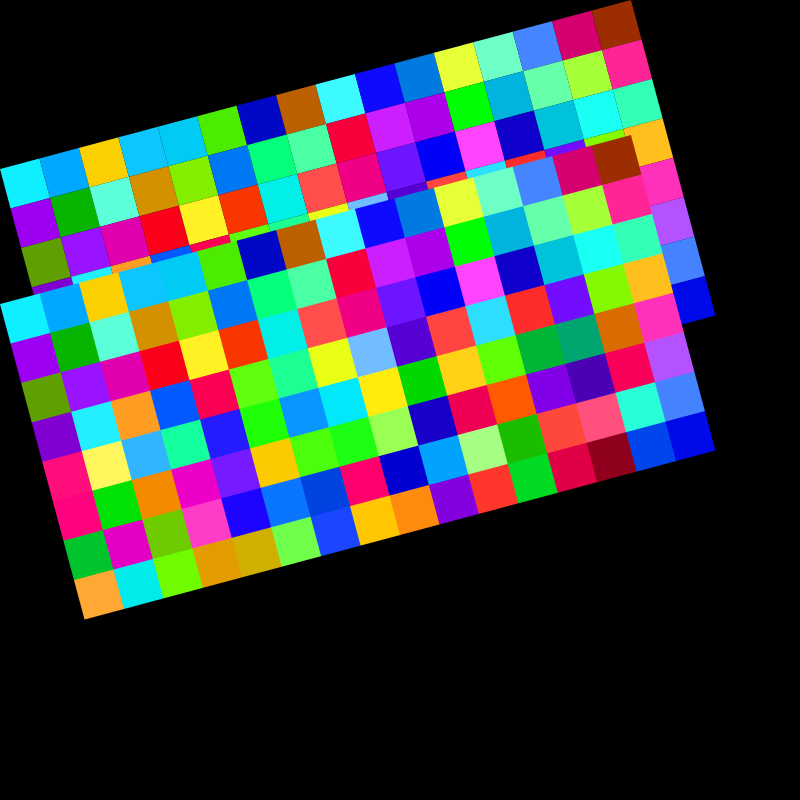 This is a black background with a colorful pattern of squares arranged in rows. There are twelve rows of squares, each row containing different colors and patterns. The squares are positioned next to each other, creating an interesting visual effect. In the bottom part of the image, there is one large square that has been filtered using a long filter. This filter enhances the overall appearance of the image by adding depth and complexity to the colorful pattern of squares. Additionally, the squares have been rotated 30 degrees, which adds an extra layer of visual interest and makes the pattern more dynamic.