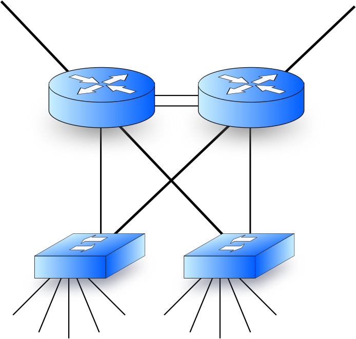 This features a network diagram with two routers and two switches. Each of the routers is connected to the backbone, while each of the switches has access ports. The switches are positioned on either side of the routers, creating an organized and functional network setup. This type of arrangement allows for efficient communication between devices within the network, ensuring smooth data transfer and connectivity.