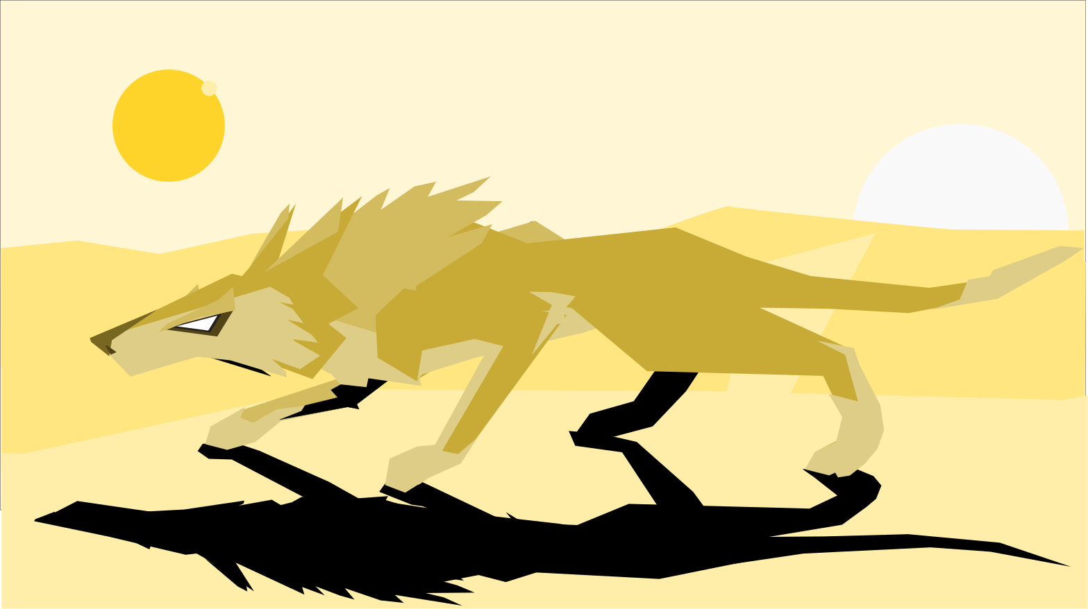 This features a yellow dog-like creature, possibly a wolf or a hyena, walking across the desert. It appears to be casting a shadow on the ground as it moves along its path. The sun is visible in the background, creating an interesting contrast between the warm colors of the animal and the cooler tones of the sky. This image captures the essence of a wild creature traversing through a natural environment, evoking a sense of adventure and freedom.