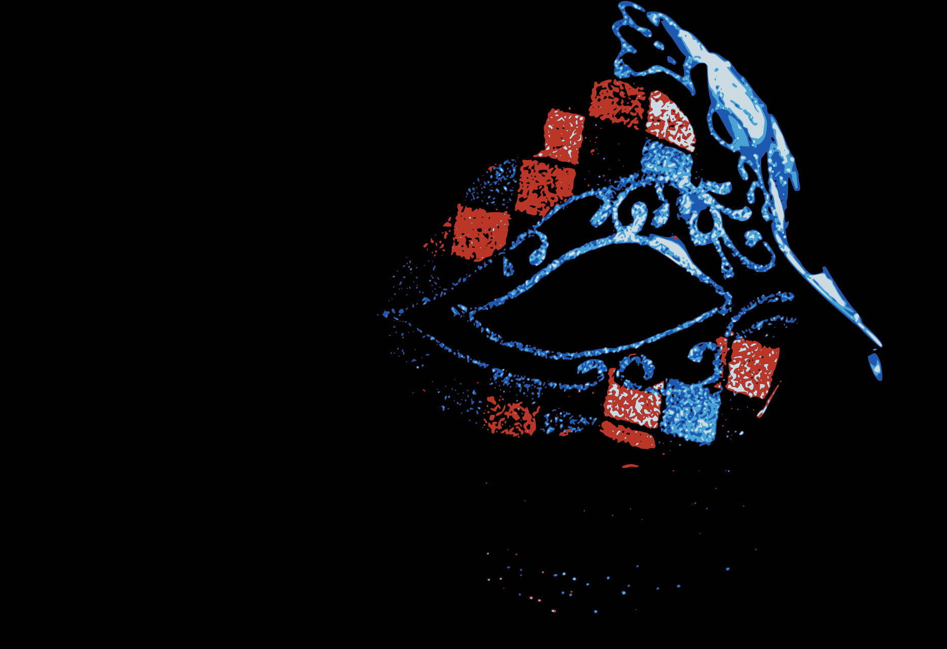 This features a black background with a blue, red and white mask on it. The mask is decorated with a checkered pattern and has an intricate design. It appears to be a close-up of the mask, showcasing its unique details. The colors used in the mask are vibrant and eye-catching, making it stand out against the dark background.