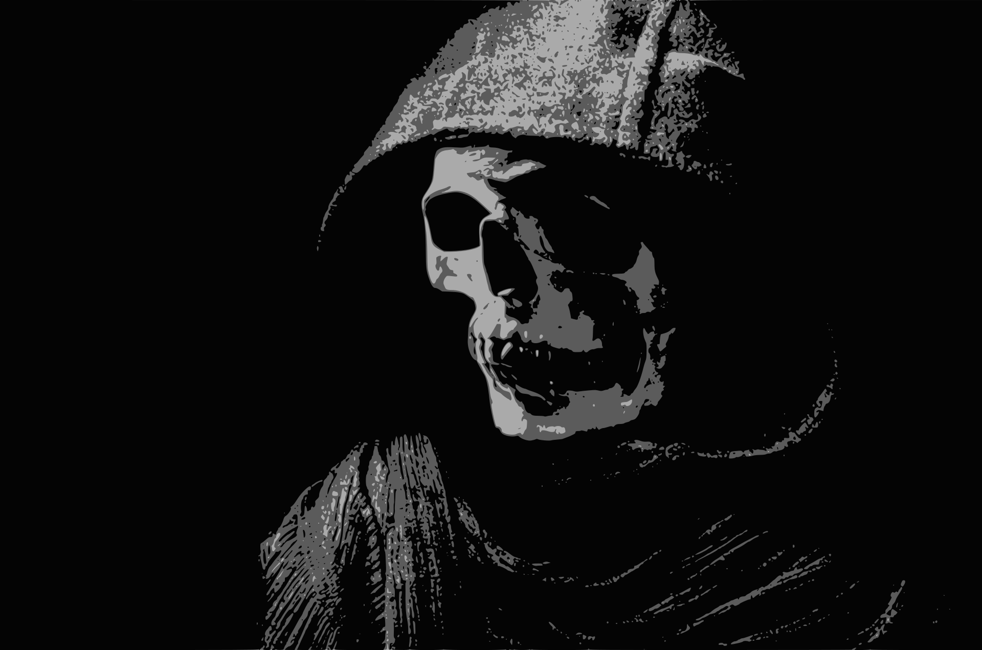 This features a black and white photo of a skeleton wearing a hooded robe. The skeletal figure appears to be looking downward, possibly towards the viewer or at something in front of it. The robe is draped over the skeleton's body, giving it an eerie appearance. The overall effect of this image is one of mystery and intrigue, as the viewer tries to decipher what the skeletal figure might be looking at or thinking about.
