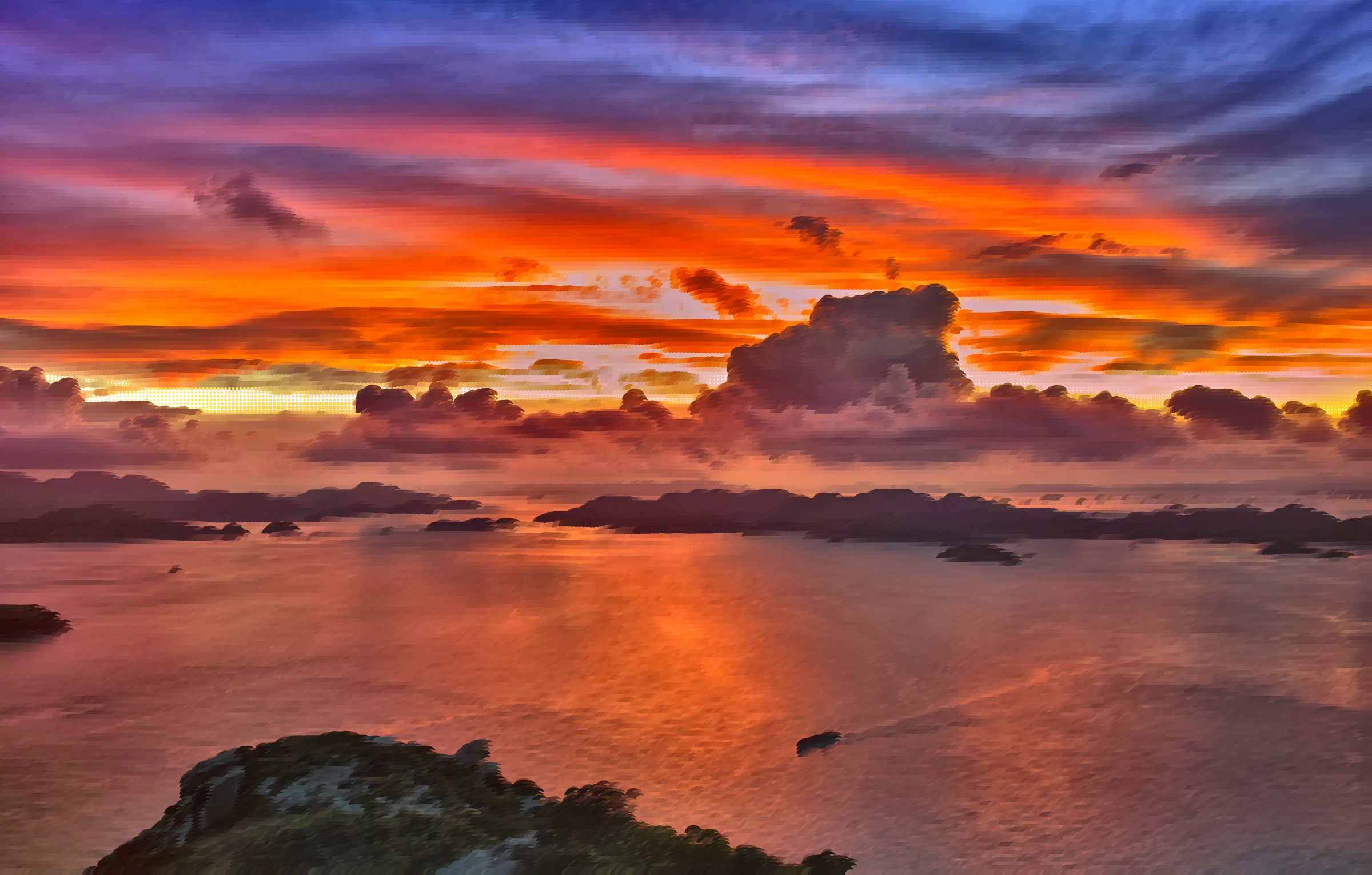 This captures a beautiful sunset over a large body of water, with the sky painted in vibrant shades of red and orange. The clouds are scattered throughout the scene, adding to the picturesque atmosphere. In the distance, there is an island that stands out against the backdrop of the ocean. A boat can be seen floating on the water, possibly enjoying the serene view or heading towards the shore. The combination of the sunset, the vast body of water, and the presence of the island creates a tranquil and captivating scene.