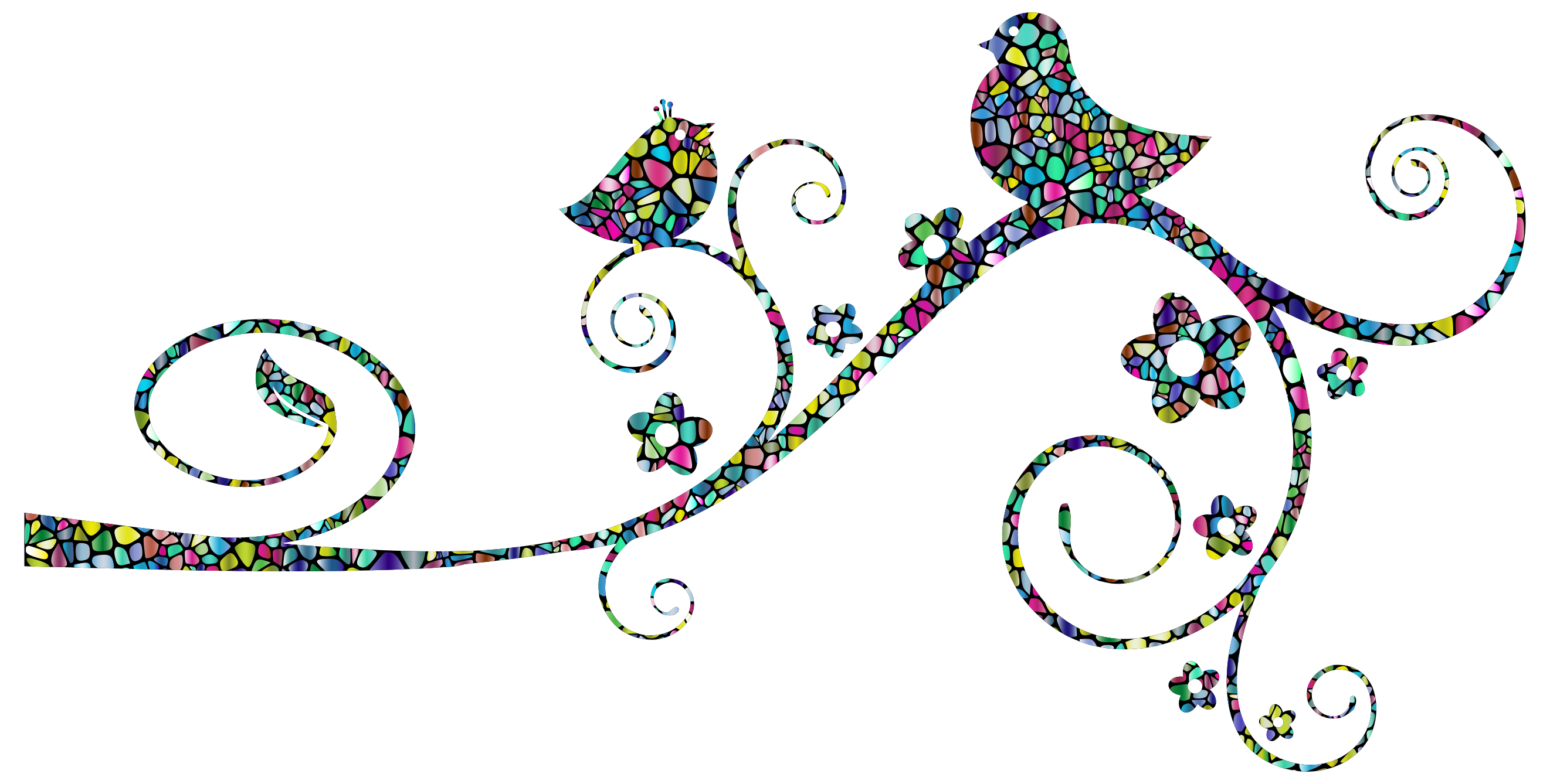 This features a branch with two birds sitting on it. The branch is adorned with colorful flowers, adding to the overall beauty of the scene. The birds are perched at different positions on the branch, creating an interesting visual composition. The combination of the birds and the vibrant flowers creates a lively atmosphere in this artistic depiction.