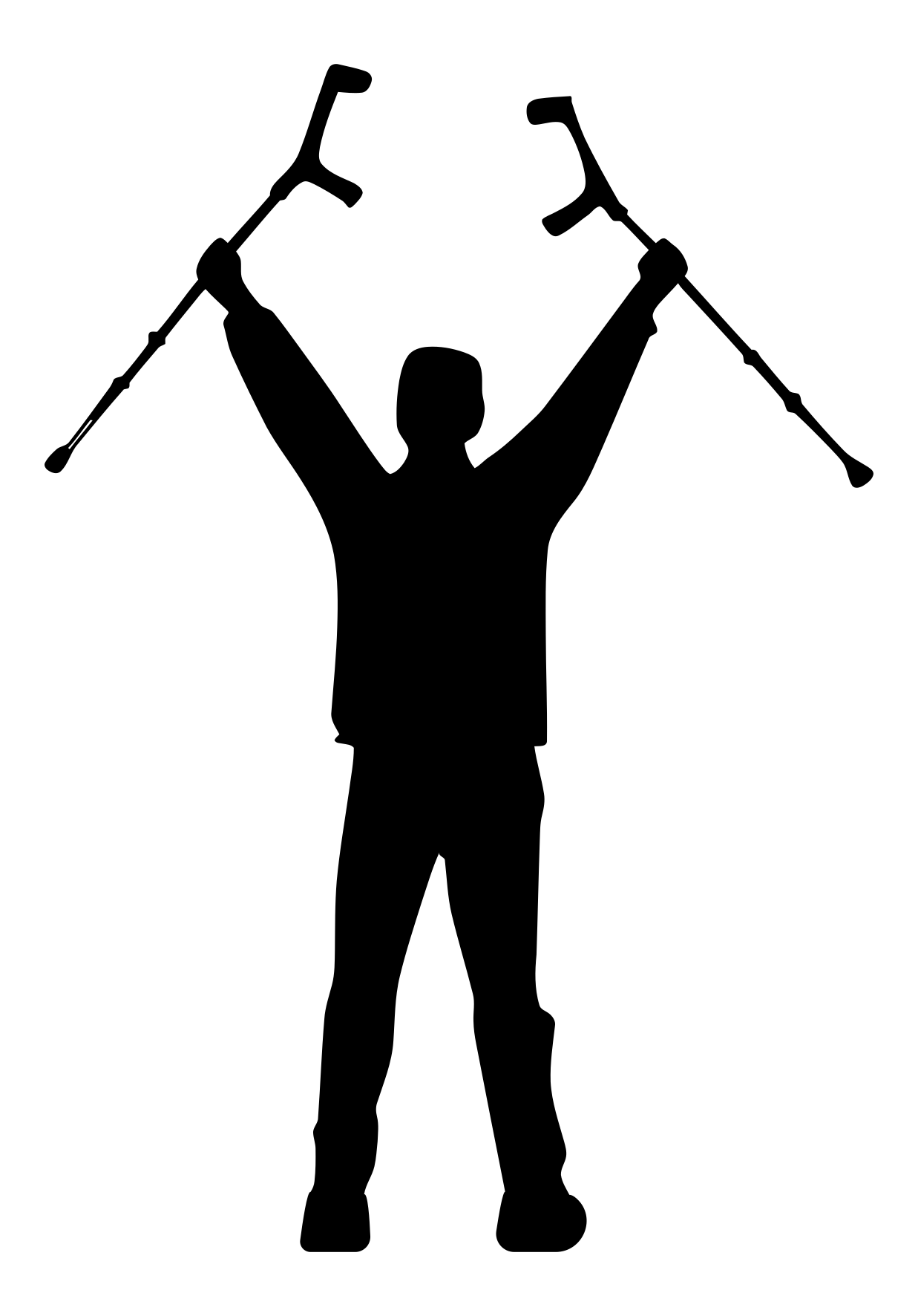 This features a silhouette of a person standing in the air, holding two walking crutches. The man appears to be celebrating or triumphantly displaying his achievement with the crutches. The black and white nature of the image adds an artistic touch to the scene, emphasizing the contrast between the figure and its surroundings. This silhouette could represent a person overcoming challenges or facing adversity, as they proudly hold their walking sticks in the air.