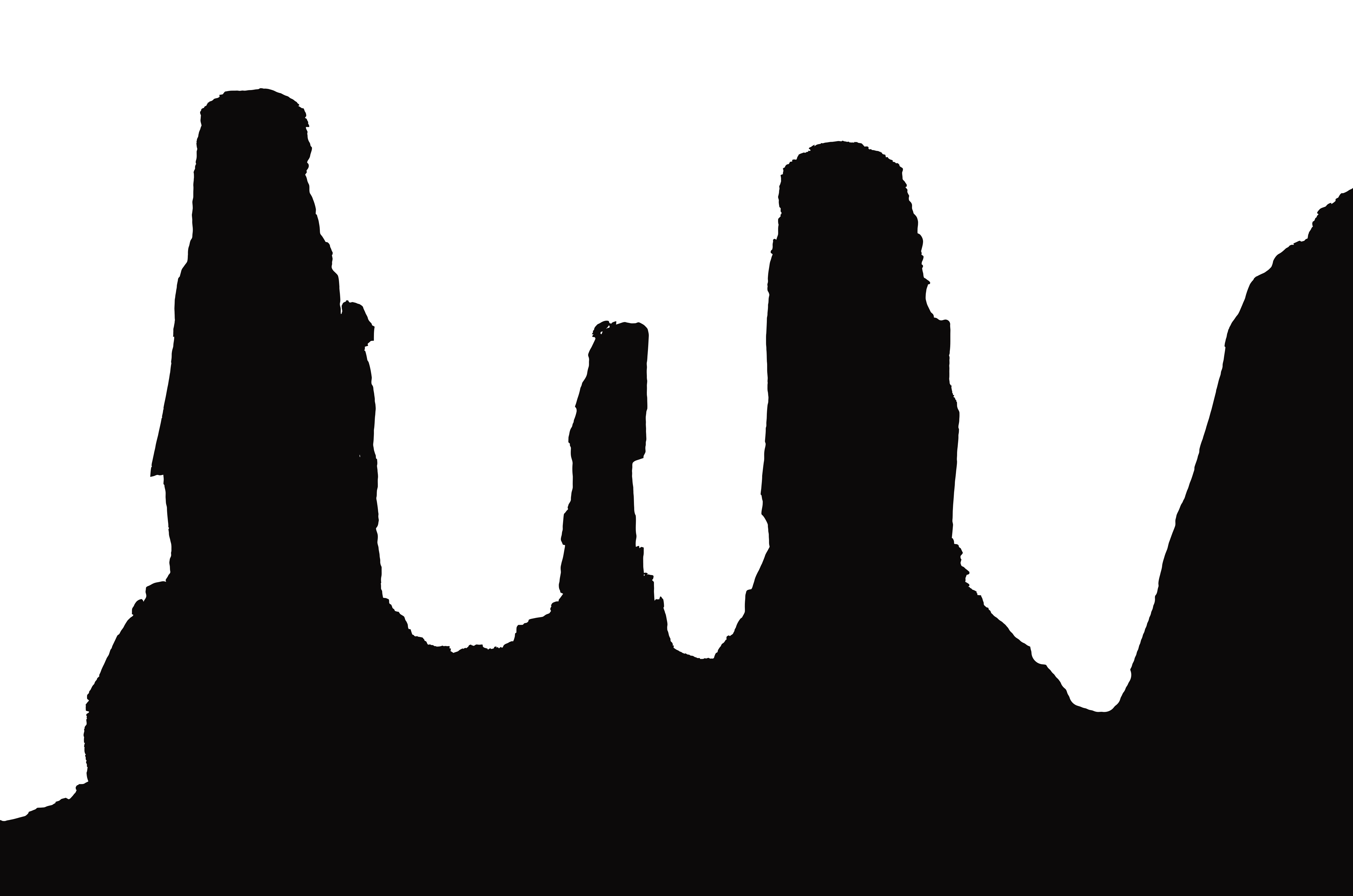 This features a silhouette of Monument Valley, which is an iconic landscape in the southwestern United States. The valley consists of towering rock formations that rise dramatically from the surrounding desert floor. In this particular scene, there are four prominent rock formations visible, with one on the left side and three on the right side of the image. The silhouette creates a striking contrast against the sky, emphasizing the grandeur and beauty of Monument Valley.