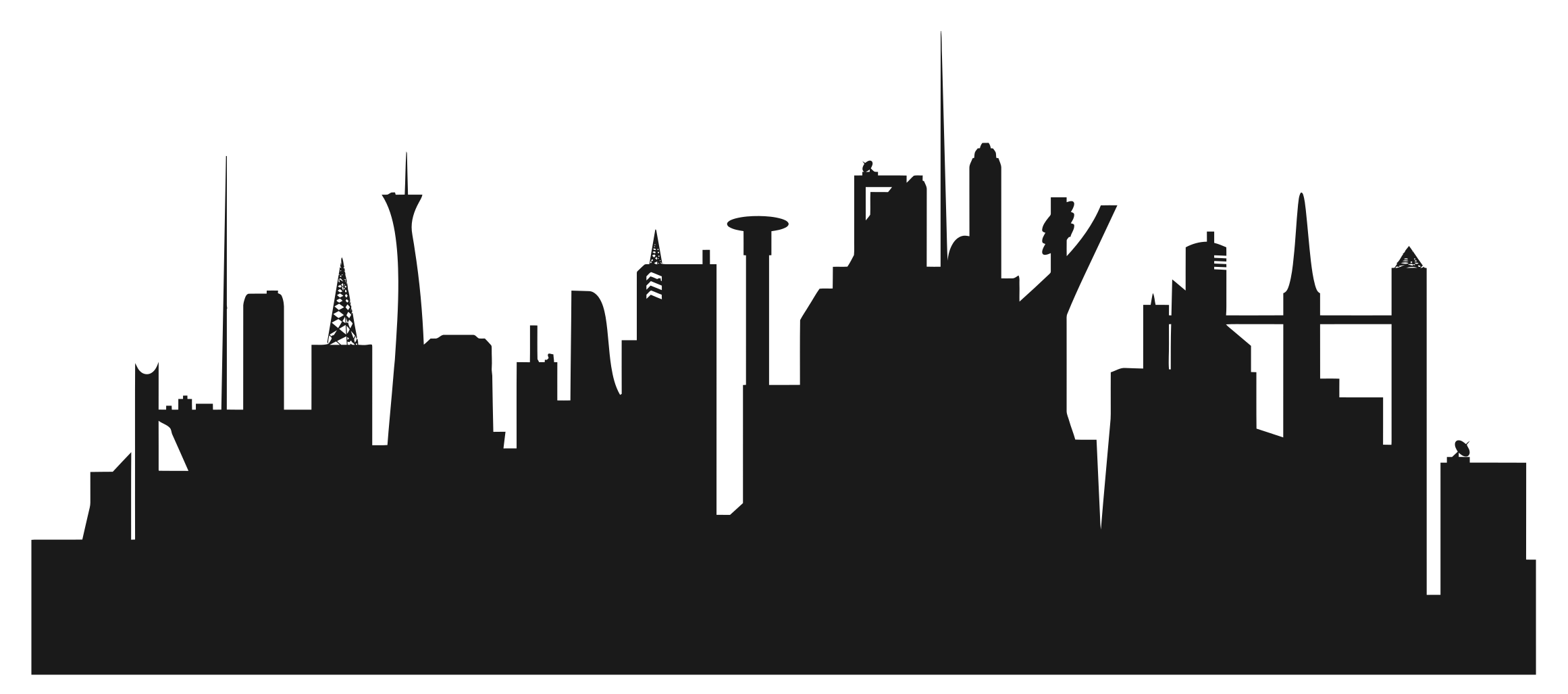 This is a black and white silhouette of a city skyline, featuring various buildings in the foreground. In the background, there are several boats scattered throughout the scene, adding to the overall atmosphere of the cityscape. The combination of the city's architecture and the presence of water creates an interesting contrast between urban life and leisure activities. This unique perspective showcases both the city's buildings and its maritime elements in a single image.