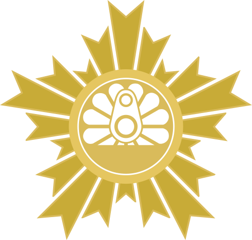 This features a golden sun with a yellow center, surrounded by twelve rays. In the middle of the sun, there is an emblem that resembles a movie camera. This design gives off a sense of artistic and creative vibe. The sun's rays are spread out in various directions, creating a visually appealing pattern. Overall, it appears to be a unique and eye-catching symbol.