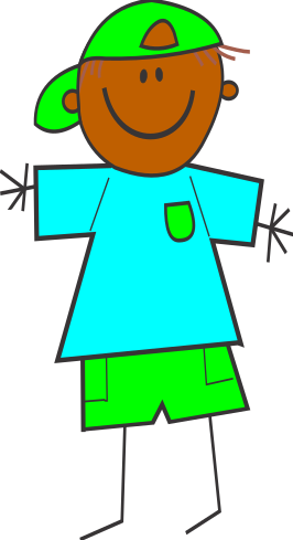 This features a colorful cartoon character, specifically a smiling boy wearing a green hat and a light blue shirt. He is holding his arms out wide, giving the impression of being happy or excited. His shorts are also green, adding to the overall vibrant appearance of the character. In addition to his clothing, he has a pocket on one of his nipples, which adds an extra touch of detail to the cartoon figure.