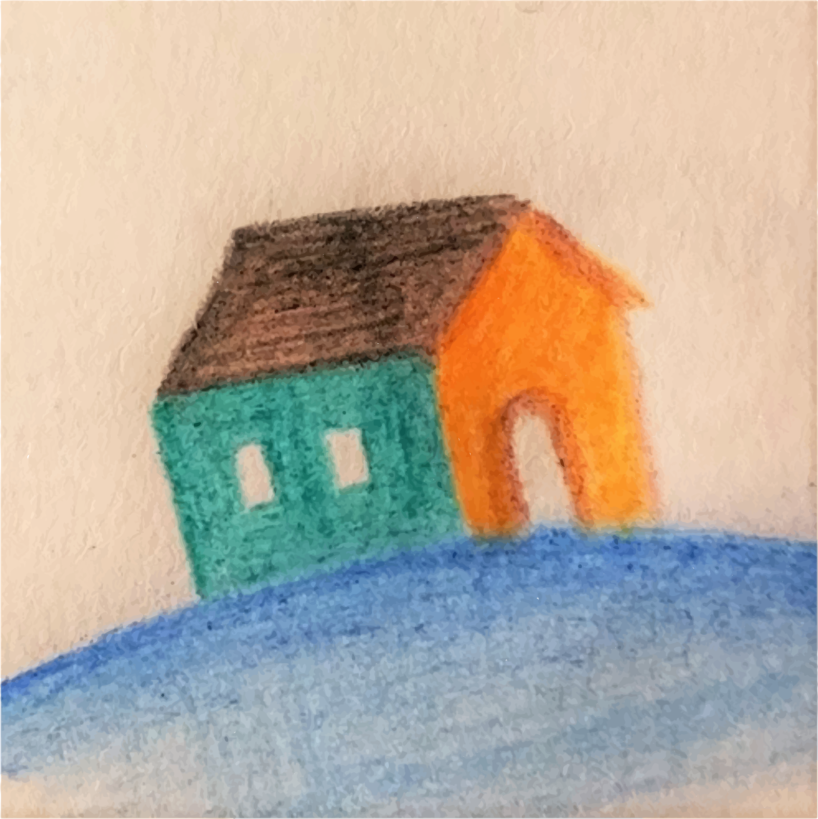 This features a house drawing with a blue roof and an orange body. It is situated on top of a green hill, giving the impression that it's floating in the air. The house has a brown roof, adding to its unique appearance. The scene appears to be set against a backdrop of a blue sky, creating a sense of depth and dimension to the drawing.