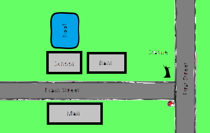 This is a cartoon-like map of an area, featuring a mailbox and a dog. The mailbox is located in the middle of the scene, while the dog can be seen on the right side of the map. There are also several other elements present in the map, such as a car, a truck, and two people. Additionally, there are three traffic lights visible at different points within the image. The overall style of the map is reminiscent of a children's book or a comic strip, making it an interesting and playful representation of the area.