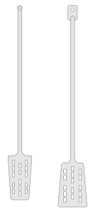This features two white paddles, each with a black outline. They are placed side by side on a brown background, creating an interesting contrast between the colors. One of the paddles is slightly smaller than the other, adding variety to the scene. These paddles could be used for various purposes such as cooking or brewing, and their unique design makes them stand out in the image.