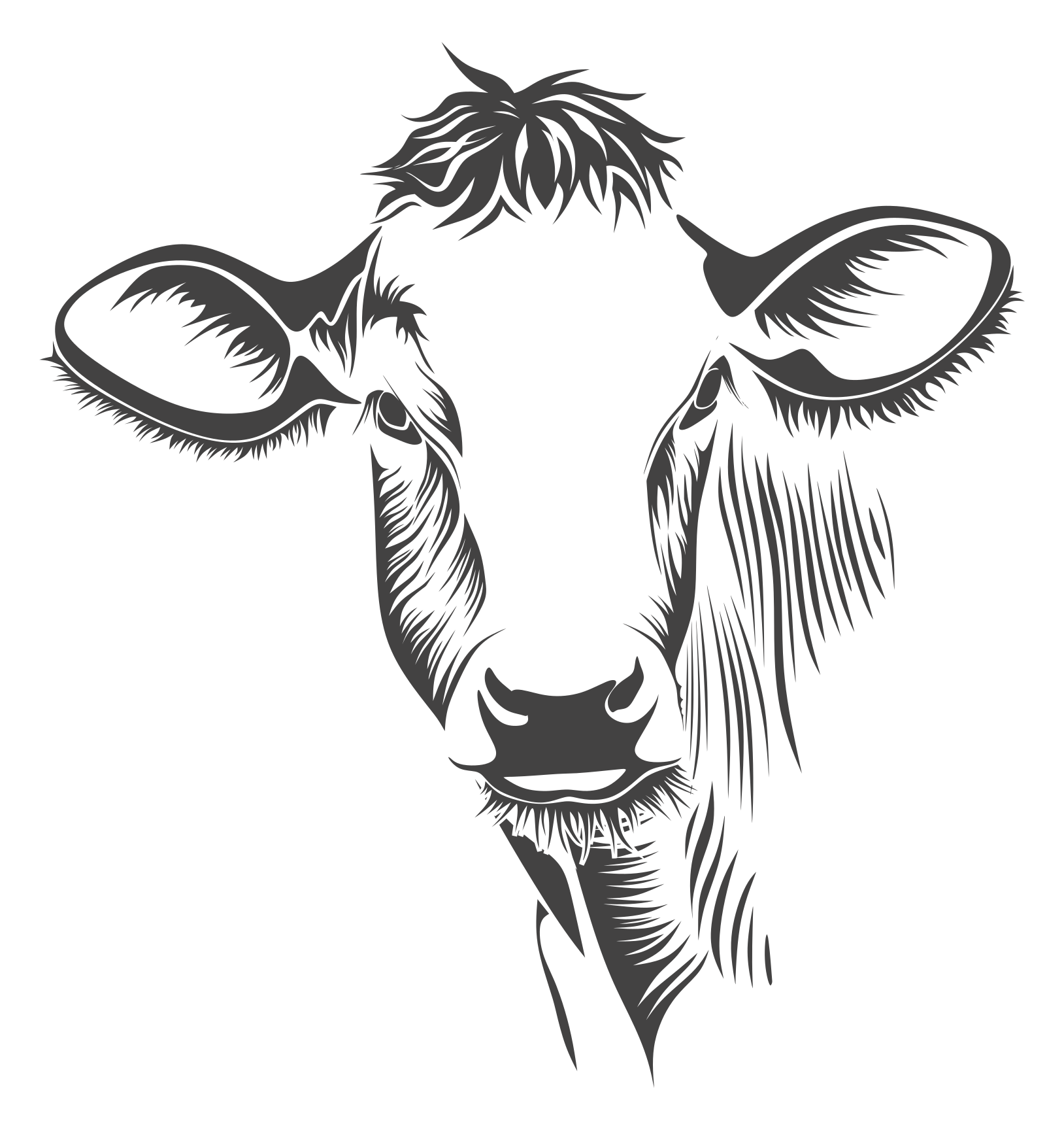 This features a cow with its head tilted to the side, looking at something. It is an artistic drawing of a cow's face and neck, showcasing the animal's unique features. The cow has two large ears on either side of its head, which are prominently displayed in the drawing. Additionally, there are two small horns visible above the cow's eyes, adding to the realism of the image. Overall, it is a captivating and detailed illustration of a cow's face.