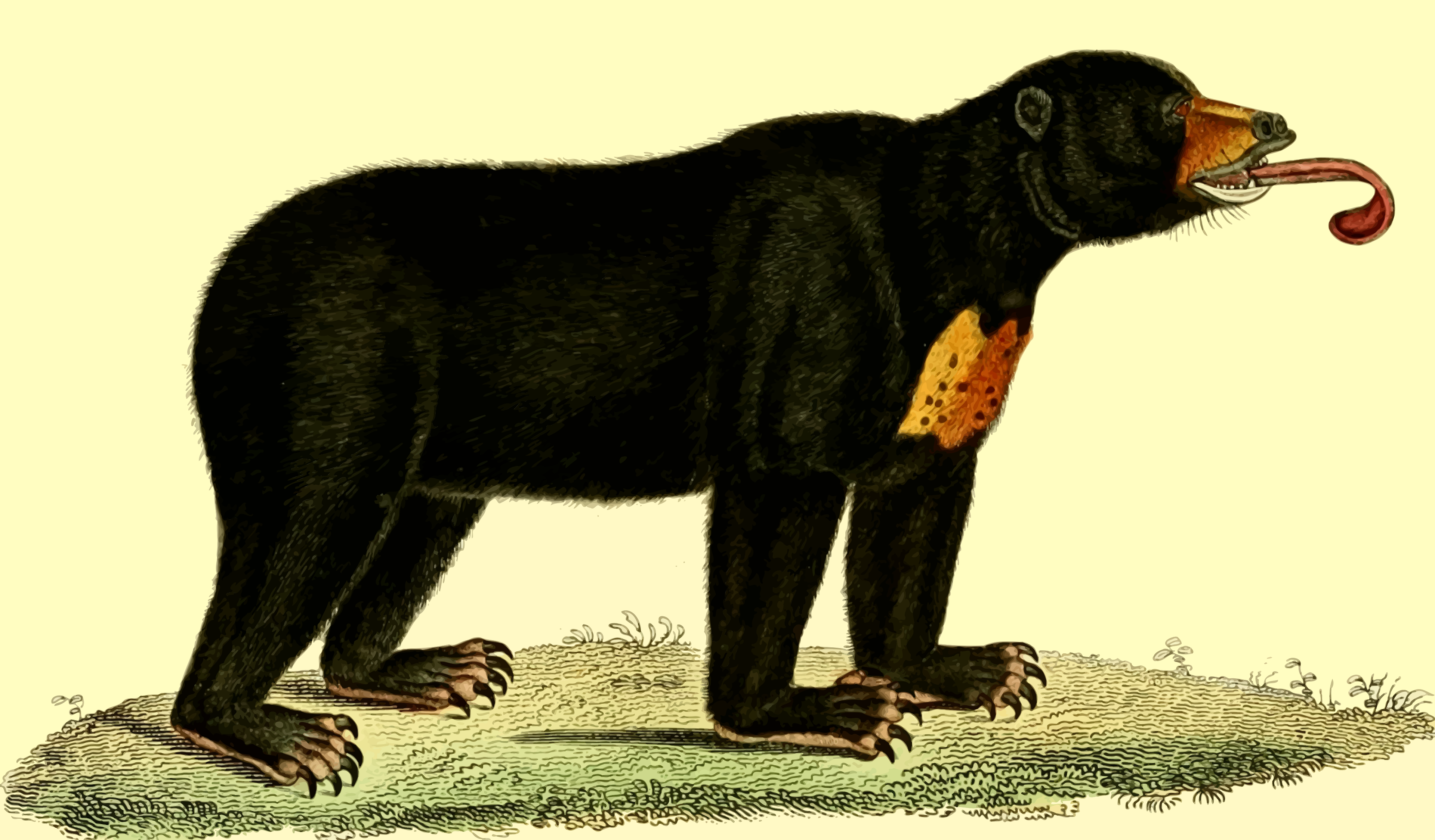 This features a large black bear with an orange and yellow patch on its chest. It appears to be standing on all fours, possibly in a grassy area or on some dirt. The bear's mouth is open, giving the impression that it might be growling or showing off its teeth. This drawing of the bear has been done in a detailed manner, capturing the animal's features and posture accurately.