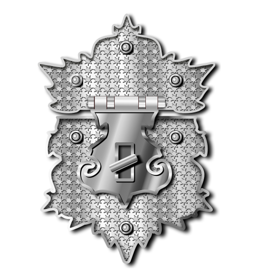 This features a silver metal emblem with an ornate design. It is shaped like a key and has a lock on it, giving the impression of a keyhole. The emblem appears to be made from metal or possibly a combination of metal and other materials. The intricate details in the design make it stand out as a unique piece of artwork.