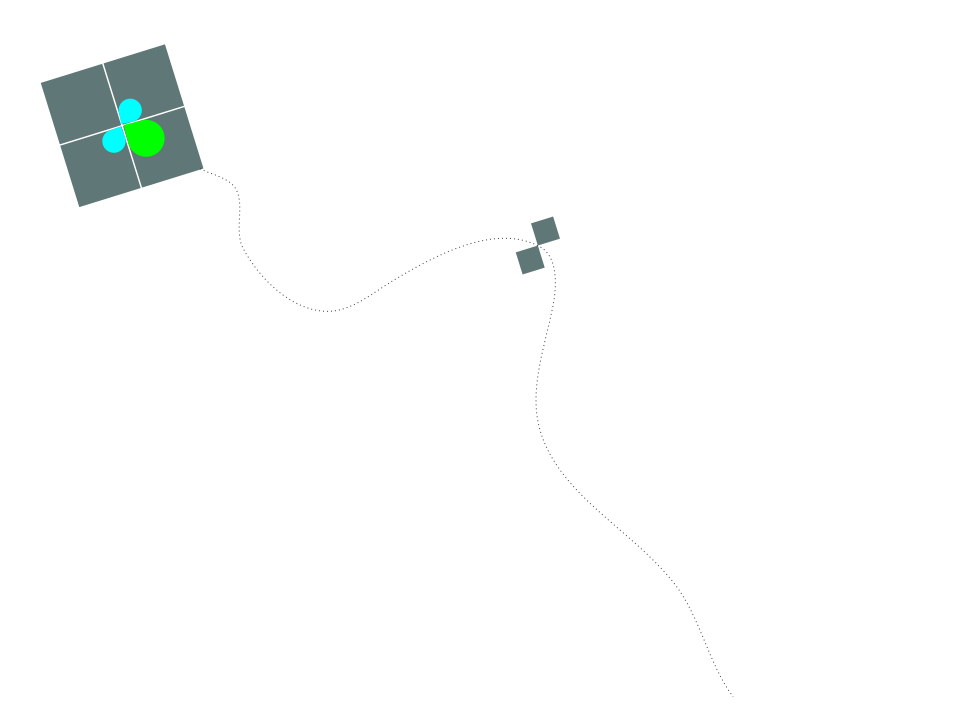 This features a white square grid with green clovers on it, resembling a game board. A line is drawn from the center of the grid to one corner, creating an arrow pointing towards that direction. This drawing appears to be a representation of a kite flying in the air, as suggested by the previous description. The kite's shape and color are consistent with the image's depiction, adding a sense of realism to the scene.