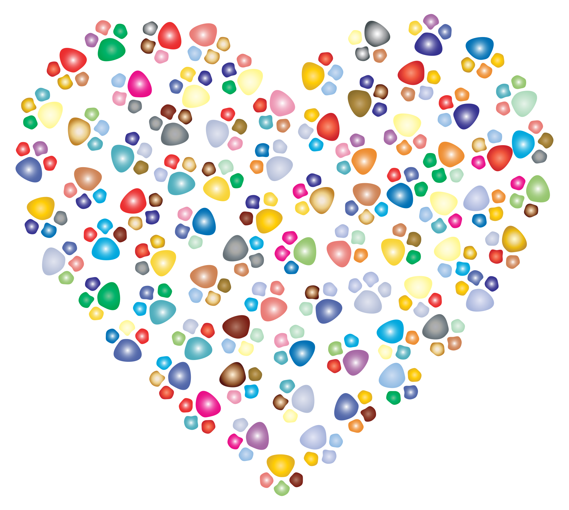 This features a heart-shaped design made up of various colored paw prints. Each paw print is unique, with different colors and sizes, creating an eye-catching pattern that resembles a heart. The paws are scattered all over the heart, filling it with vibrant life and energy. This creative display showcases the beauty of nature's diversity while also serving as a playful and artistic representation of love.