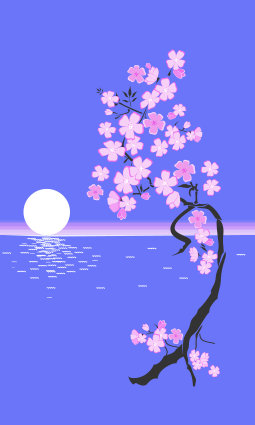 This features a beautiful pink cherry blossom tree with delicate flowers, floating above the water. In the distance, there is a full moon on the horizon and its reflection can be seen in the water below. This serene scene creates an atmosphere of tranquility and peacefulness. The combination of the vibrant colors of the cherry blossoms and the gentle glow of the moon make for a captivating visual experience.