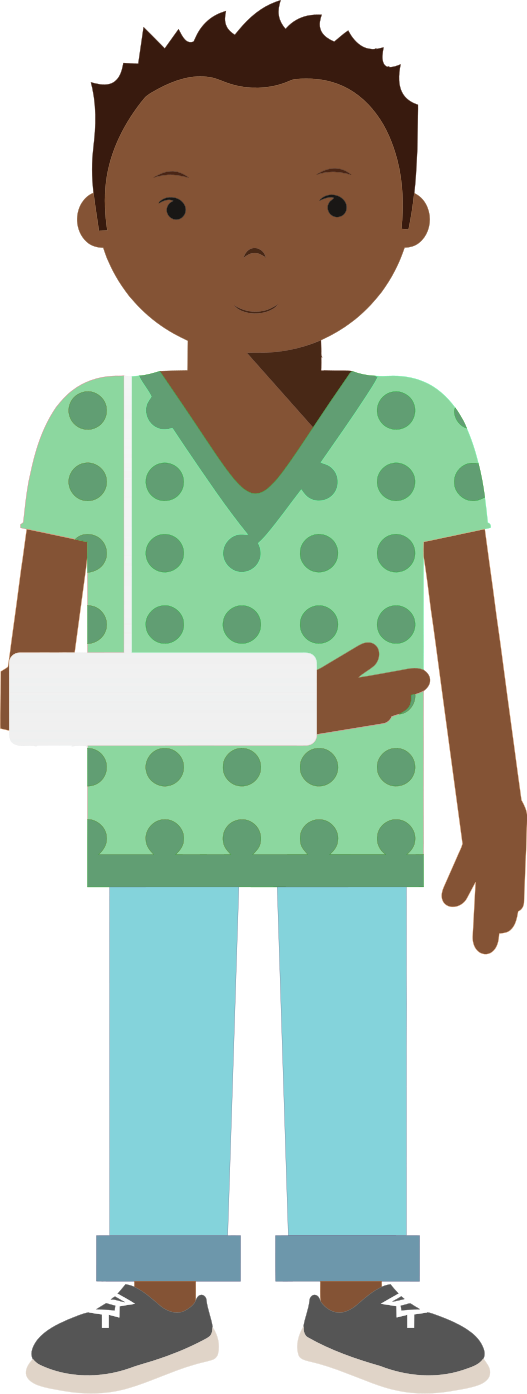 This features a cartoon man wearing a green shirt and blue pants. He is holding a white object in his hand, possibly an x-ray or some other medical equipment. The man appears to be standing next to a wall, giving the impression that he might be at a hospital or a similar location. His facial expression suggests that he may be concerned about his injury or waiting for further treatment.