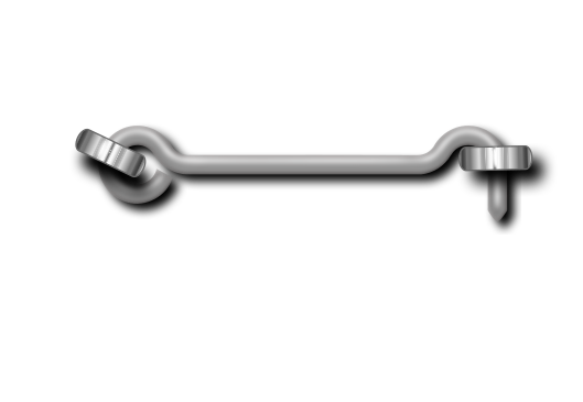 This features a silver metal hook with a bent wire latch, which is designed to keep a screen door closed. The hook is attached to the wall and has a small loop on one end that can be used for hanging items or attaching additional hardware. The overall design of the hook suggests it could be used in various settings where a simple yet effective way to secure doors or screens is needed.