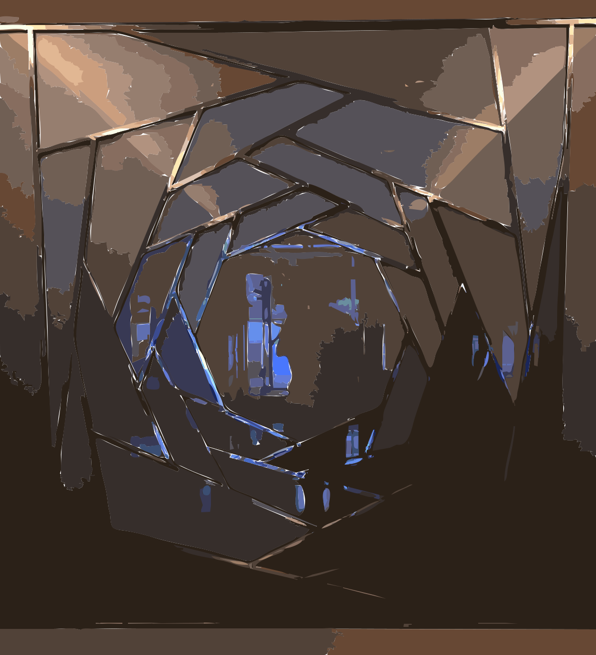 This features a large, ornate glass structure with an intricate design. Inside the structure, there is a person standing in front of a mirrored surface that reflects their image. The mirror creates a unique perspective and adds depth to the scene. The room appears to be dimly lit, giving it a somewhat mysterious atmosphere.