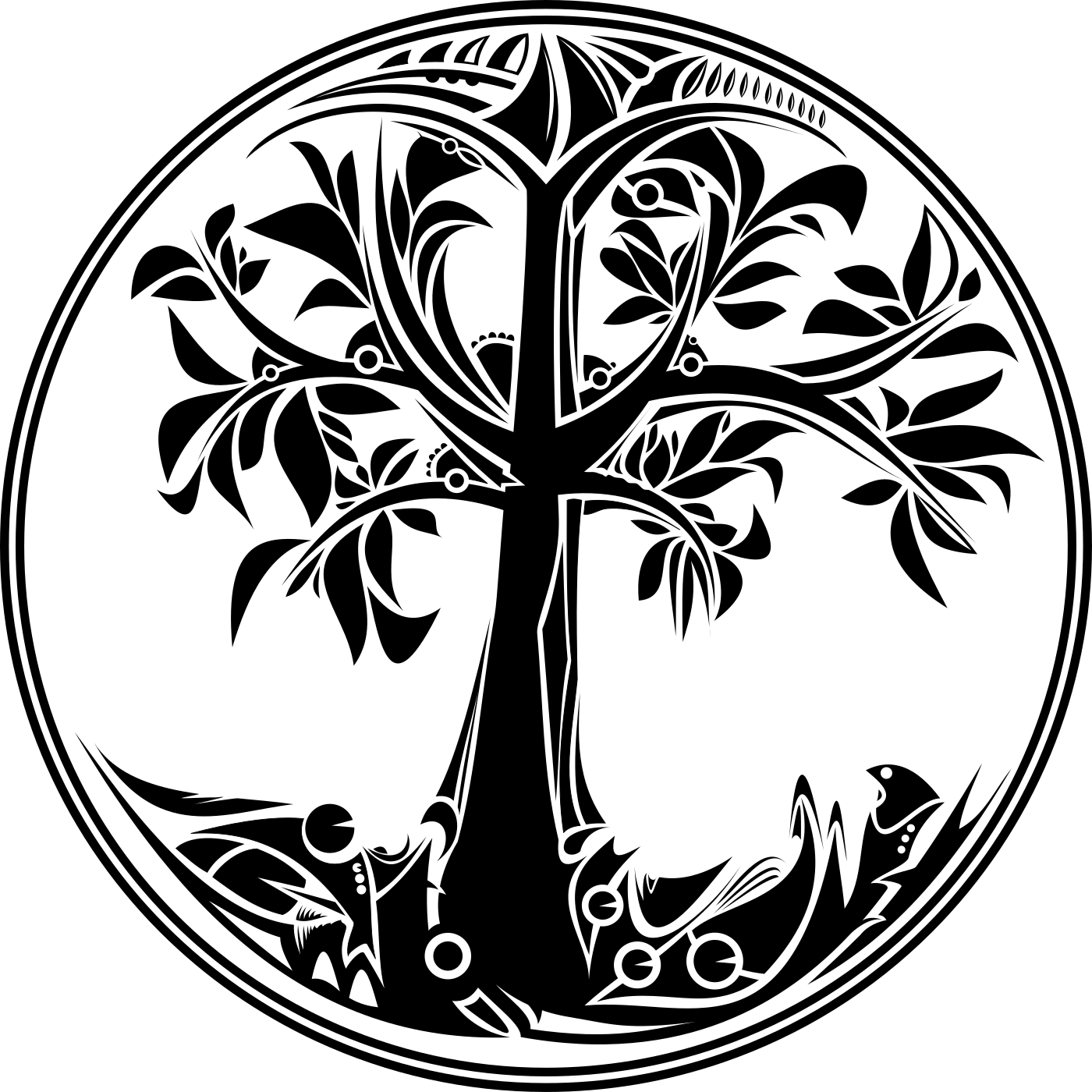 This features a black and white illustration of a tree with various animals around it. There are several birds perched on the branches, as well as a snake coiled up in the roots. In addition to these creatures, there is also an owl present within the scene. The tree itself has a distinctive design, giving the impression that it could be a tree of life. This intricate illustration is set against a white background, which further emphasizes the details and contrasts between the black and white elements.