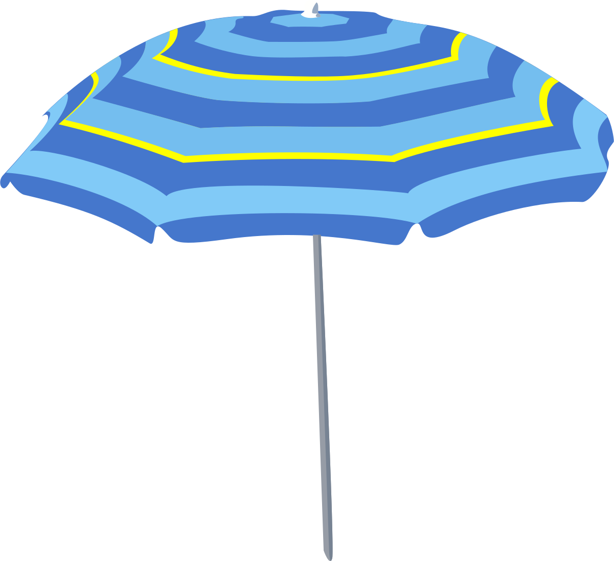 This features a blue and yellow striped umbrella with a white pole. The umbrella is open, providing shade from the sun. It appears to be a cartoon or graphic representation of an umbrella, as it has a more stylized appearance compared to real-life objects. The colors used in this image are predominantly blue and yellow, creating a vibrant and eye-catching scene.
