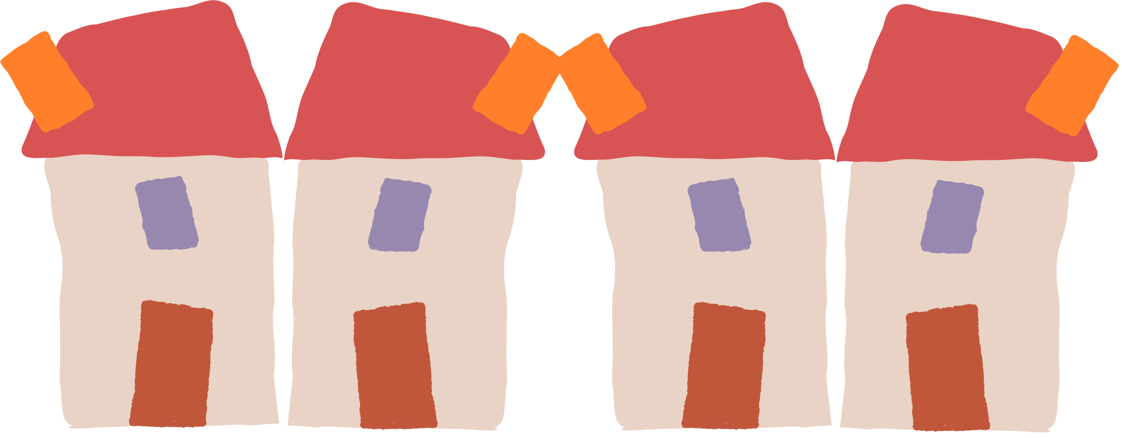 This features a creative illustration of four crooked shaped houses, each with red roofs and orange chimneys. These houses are adorned with purple windows and brown doors, giving them an interesting and unique appearance. The houses are positioned next to one another, creating a visually appealing scene that showcases the artist's creativity in designing these quirky structures.