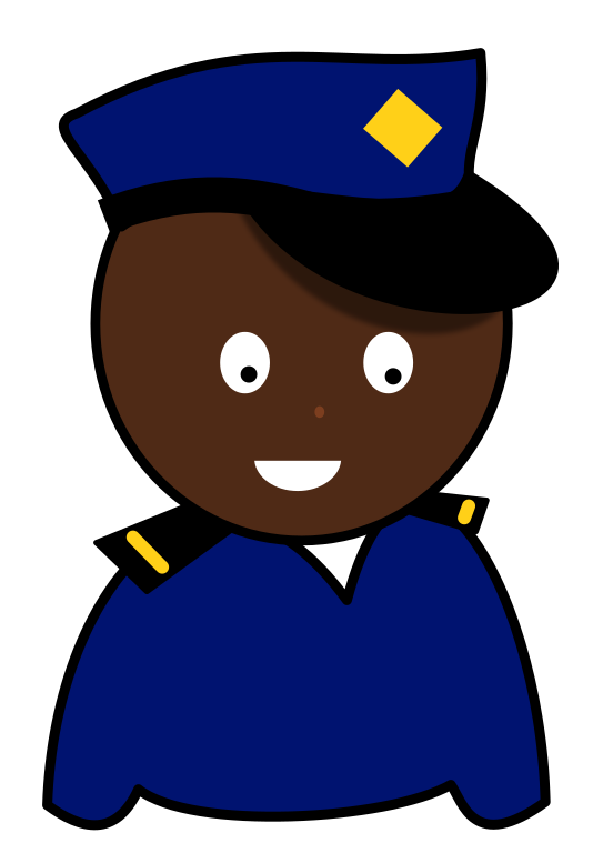 This features a cartoon-like depiction of an African police officer wearing a blue uniform and hat. The officer is smiling, giving the impression that he is friendly and approachable. The uniform consists of a jacket with buttons on it, adding to the realistic appearance of the character. The overall design of the image gives off a playful vibe, making it an appealing representation of law enforcement in a fun and engaging manner.