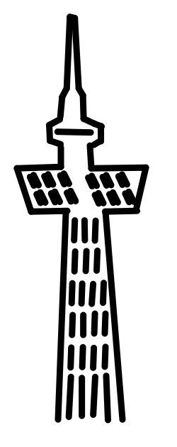 This features a black and white illustration of the Skytree Tower in Tokyo, Japan. It is an iconic landmark that stands tall against the skyline. The tower has a unique design with multiple levels, making it easily recognizable. The drawing captures the essence of this famous structure, showcasing its architectural beauty and prominence within the cityscape.