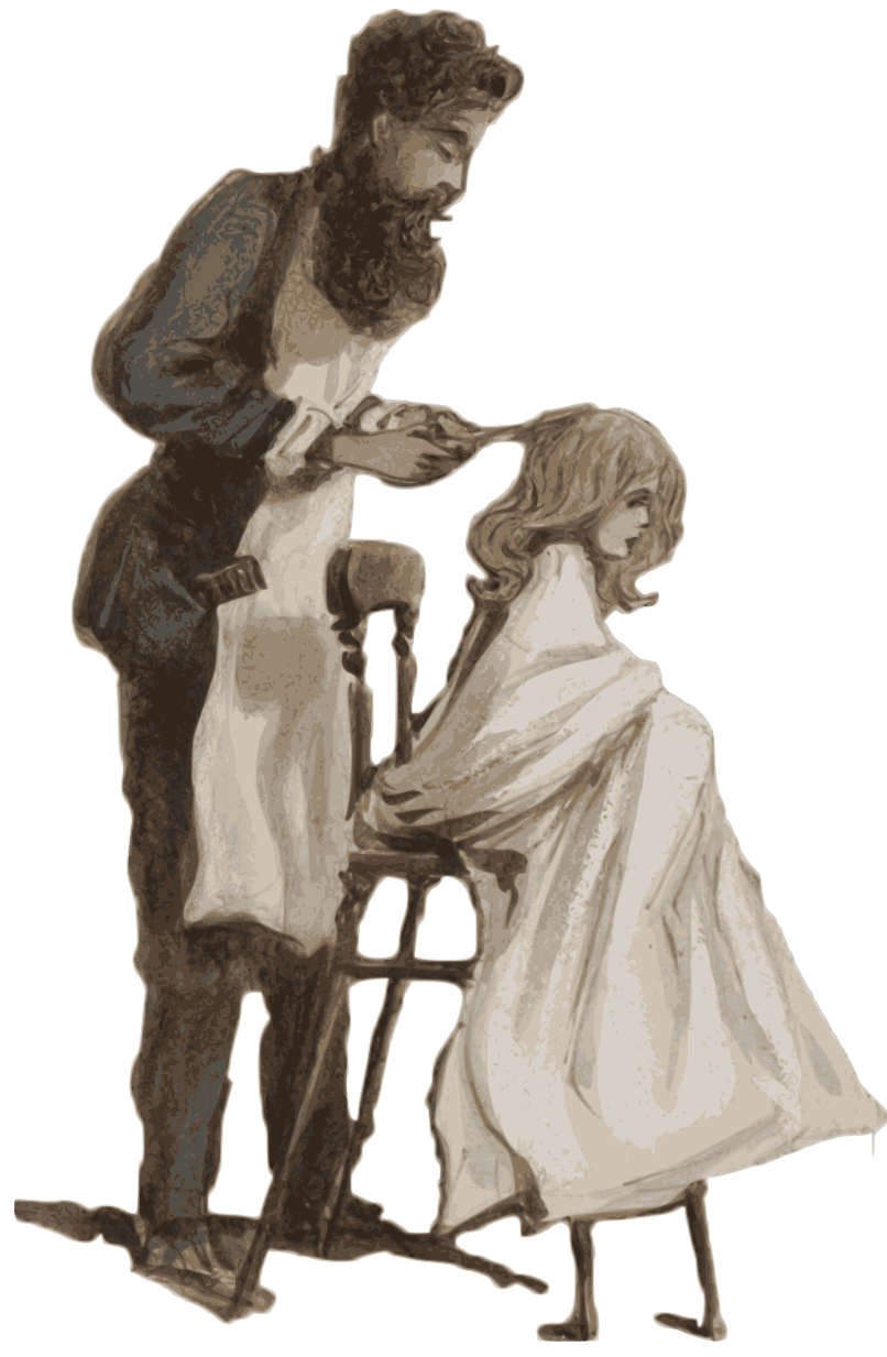 This features a man and woman in an old-fashioned setting, with the man standing over the woman who is sitting. They appear to be getting their hair cut or styled by the barber. The barber is using scissors to trim the woman's hair while she sits on a chair. The scene captures a moment of interaction between the two individuals and showcases the craftsmanship of the artist who created this illustration.