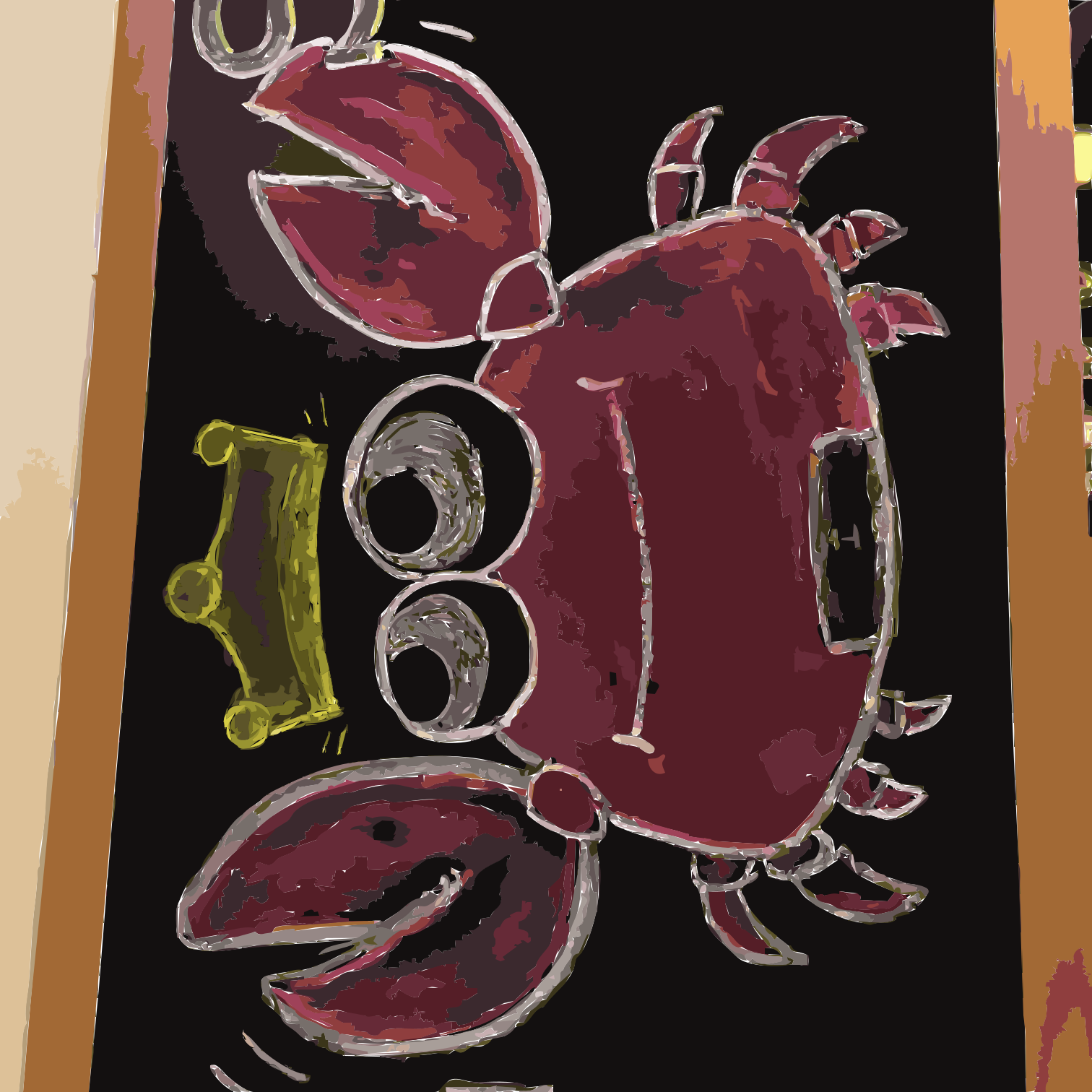 This features a unique and creative drawing of a crab on a blackboard. The crab is the main focus, taking up most of the space in the picture. It appears to be wearing a yellow crown, adding an interesting touch to its design. The crab's body is red, making it stand out against the black background. This artistic piece could be used as a decoration or even as a conversation starter for those who appreciate unconventional and imaginative designs.