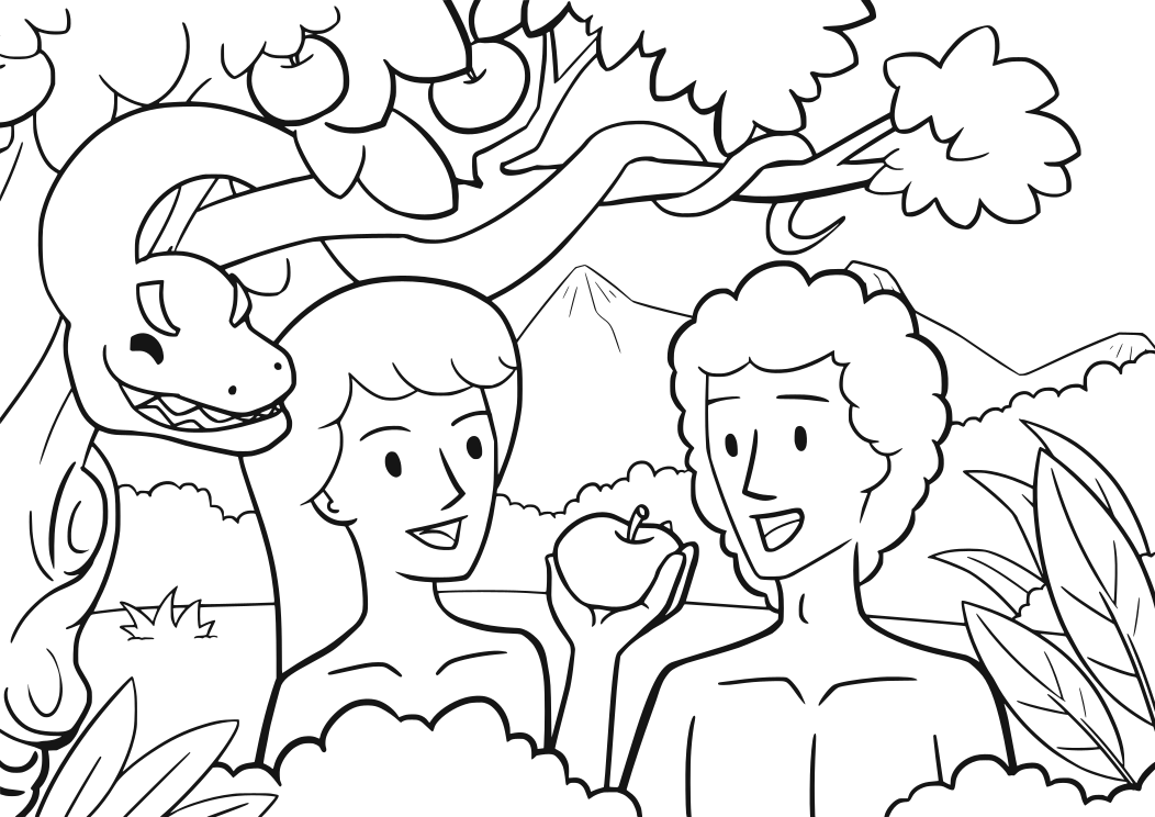 This depicts a scene from the biblical story of Adam and Eve. In this illustration, Adam is standing next to Eve who is holding an apple in her hand. They are both smiling at each other as they enjoy their time together. A snake can be seen hanging on a branch above them, adding a sense of danger or temptation to the scene. The overall atmosphere appears to be light-hearted and playful, with the characters enjoying their time in this imaginative interpretation of the biblical story.