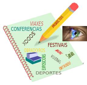 This features a book with various words and phrases written on it, including "vozes," "conferencias," "ogos," "festivas," "obradores," "as letras," "espectaculos," "deportes," "entrodos," "exemplos," and "prospetos." A yellow pencil is placed on top of the book, with a pair of eyes visible in the background. The scene appears to be a combination of words and images, possibly representing different activities or concepts related to education or learning.