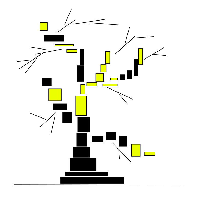 This features a unique and creative illustration of a tree made from various sized rectangles. The trunk of the tree is constructed with multiple smaller rectangles, while the branches are formed by connecting thin black lines. This artistic representation of a tree showcases an interesting perspective on nature's structure, using simple geometric shapes to create a visually appealing composition. The use of black and yellow colors adds depth and contrast to the image, making it stand out as a striking piece of artwork.