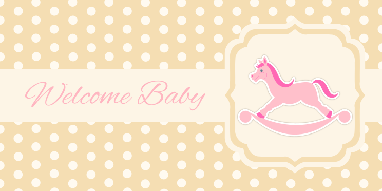 This features a welcome baby card with a pink and white polka dot background. The card has the words "welcome baby" written in pink cursive on it, creating an inviting atmosphere for newborns. On the right side of the card, there is a cute pink rocking horse, adding to the overall charm of the greeting card. This illustration showcases a warm and welcoming message for expectant parents or those celebrating the arrival of a new baby.