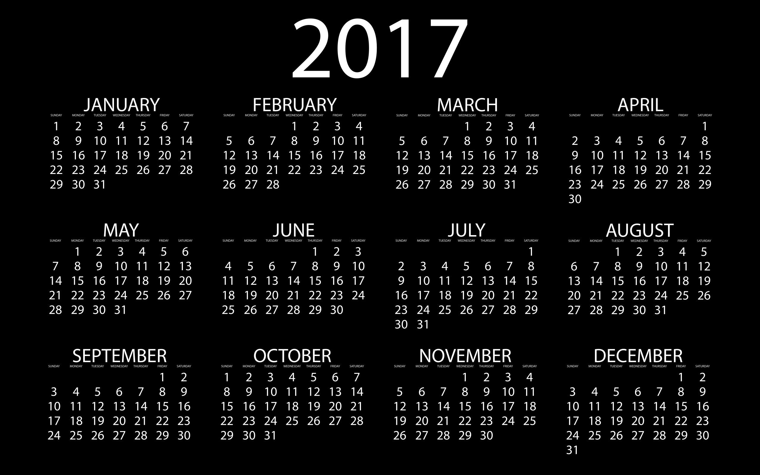 This displays a calendar for the year 2017. It is set against a black background, making it easy to read and focus on the dates. The calendar has a grid pattern with each day of the month labeled in white text. There are no other distractions or elements in the image, allowing viewers to concentrate solely on the calendar.
