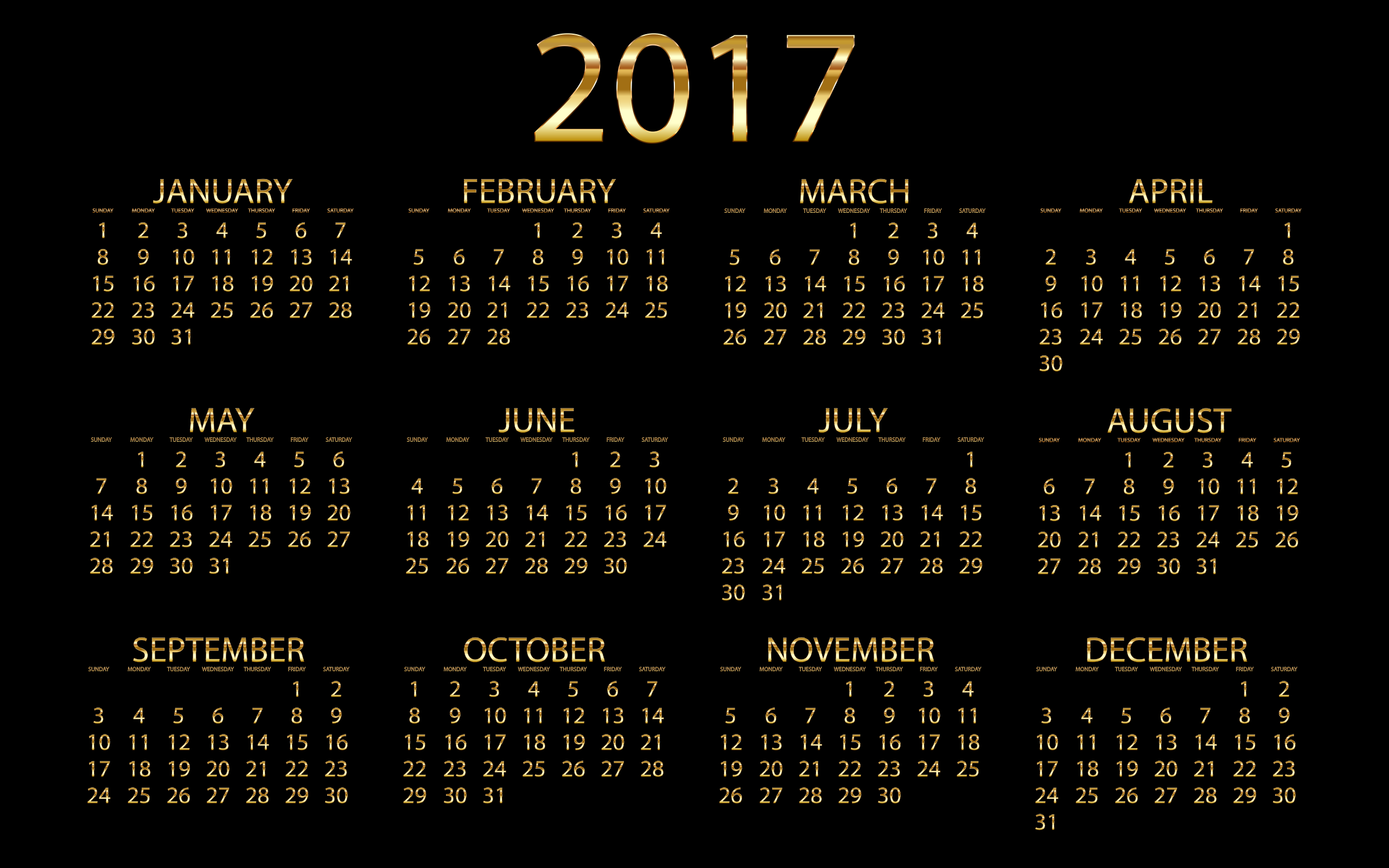 This features a calendar for the year 2017. It is a rectangular shape and has a black background with golden letters and numbers. The calendar displays the months of January, February, March, April, May, June, July, August, September, October, November, December. Each month is represented by a gold colored number or letter. This calendar is likely used to keep track of dates and appointments throughout the year.