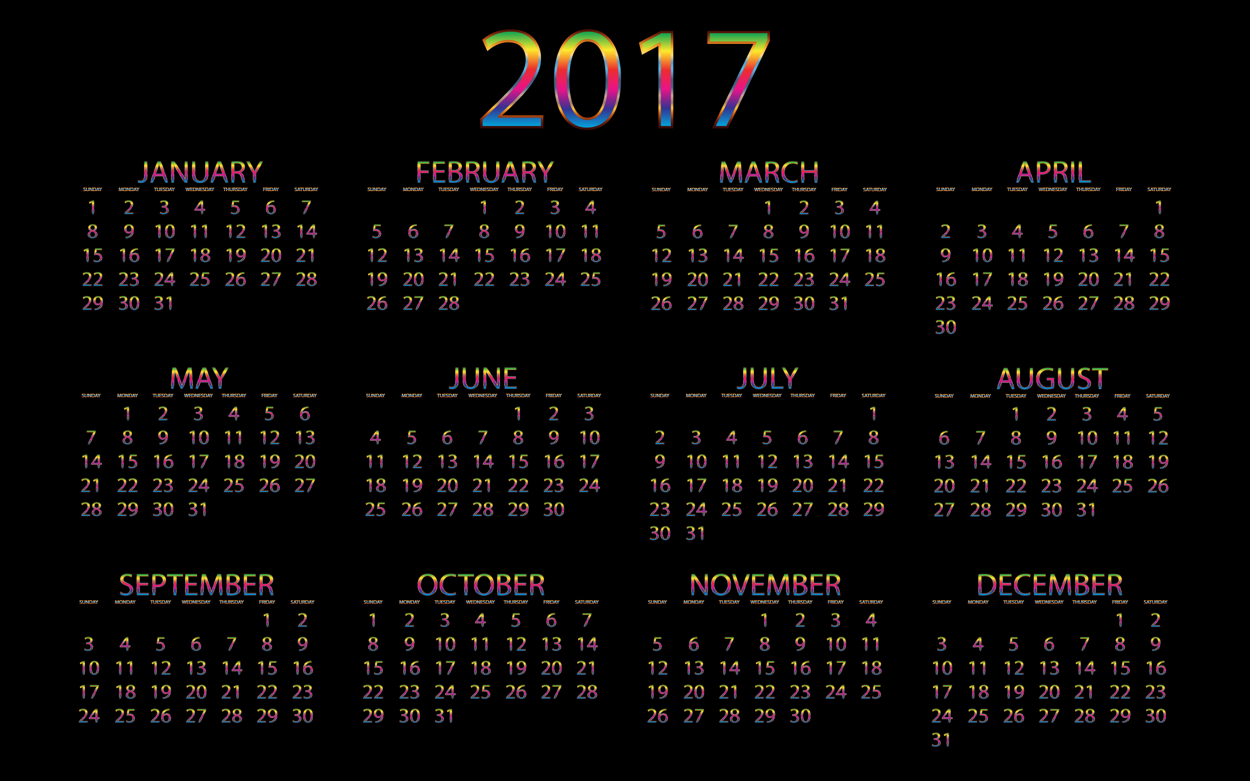 This features a 2017 calendar with a black background and vibrant colors. It is a rectangular shape, displaying the months of January through December. Each month has its own colorful box, making it visually appealing. The calendar is likely used to keep track of dates and events throughout the year.