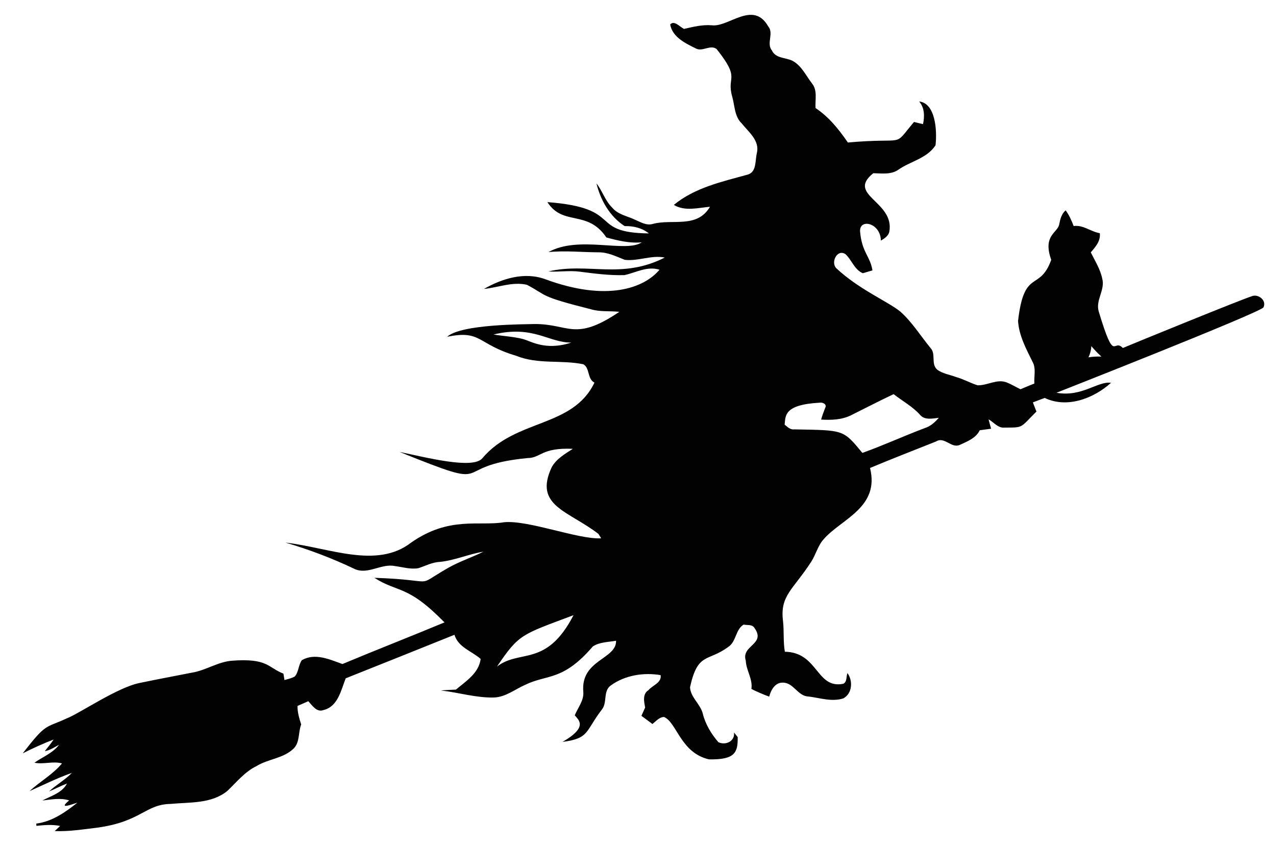 This features a witch figure flying through the air on her broom. She is holding a cat in her hand, adding an element of playfulness to the scene. The witch appears to be enjoying herself as she soars through the sky with her feline companion. The black and white color scheme of the image adds a sense of timeless charm to the scene, making it a delightful and imaginative piece of artwork.