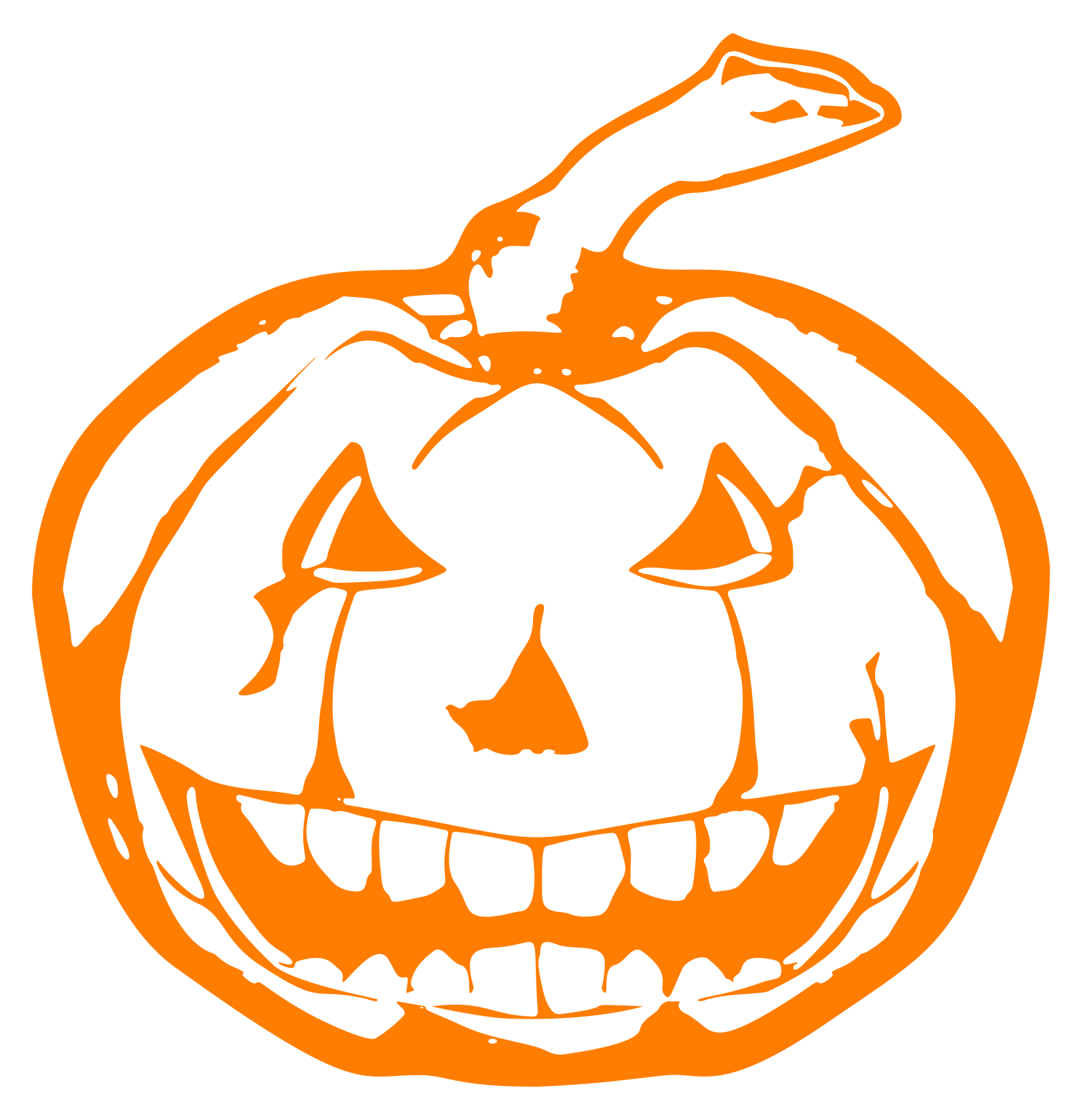 This features a large, orange pumpkin with a smiling face and a long stem on top. The pumpkin is the main focus of the image, taking up most of the space in the frame. It appears to be an orange lantern outline, adding a unique touch to the design. The pumpkin's evil carved face adds a playful and creative element to the overall appearance of the image.