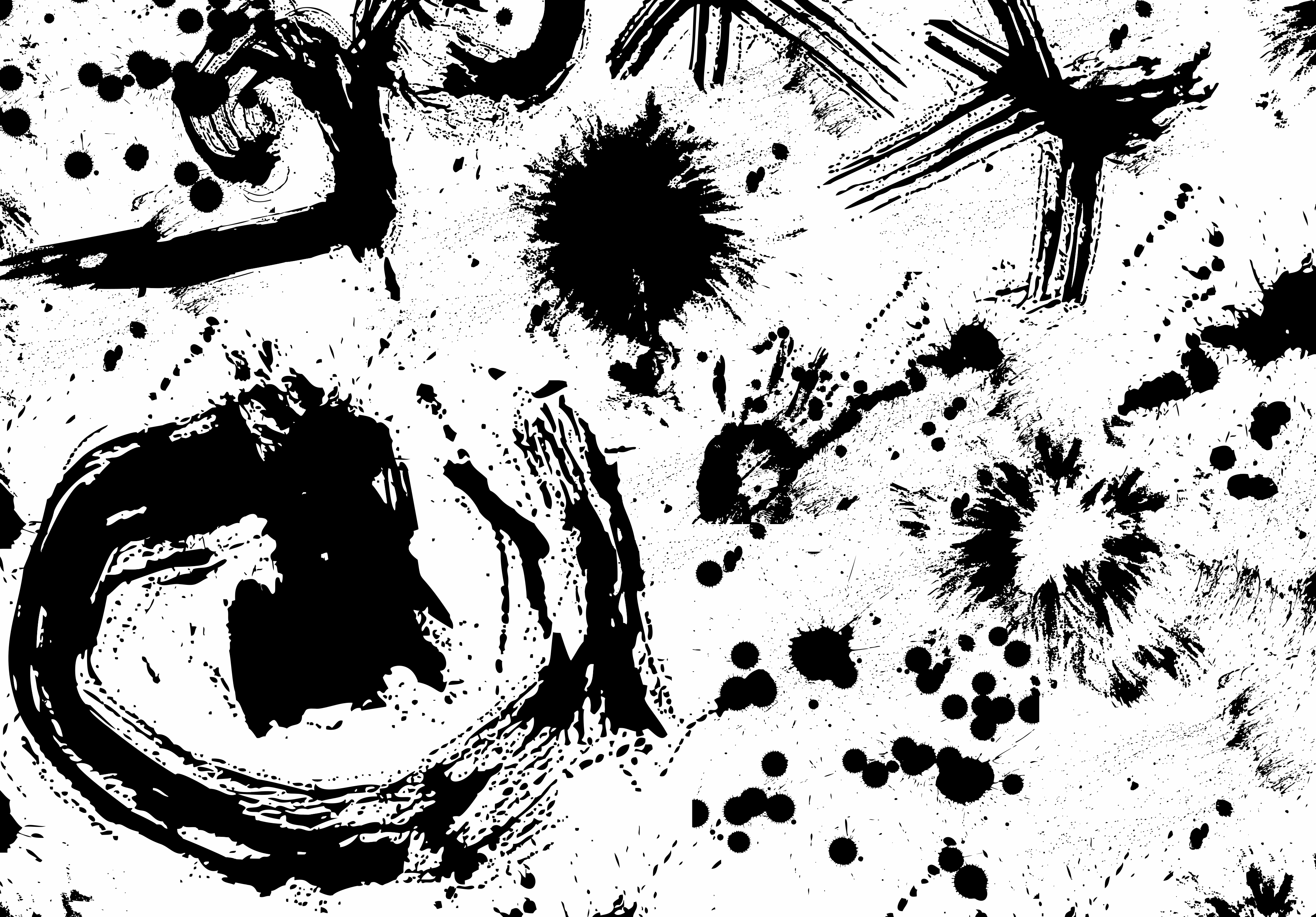 This is a black and white picture of various abstract shapes, including splats and brush strokes. These shapes are scattered throughout the scene, with some appearing more prominent than others. The overall composition creates an interesting visual effect that draws attention to the different shapes and patterns within the image.