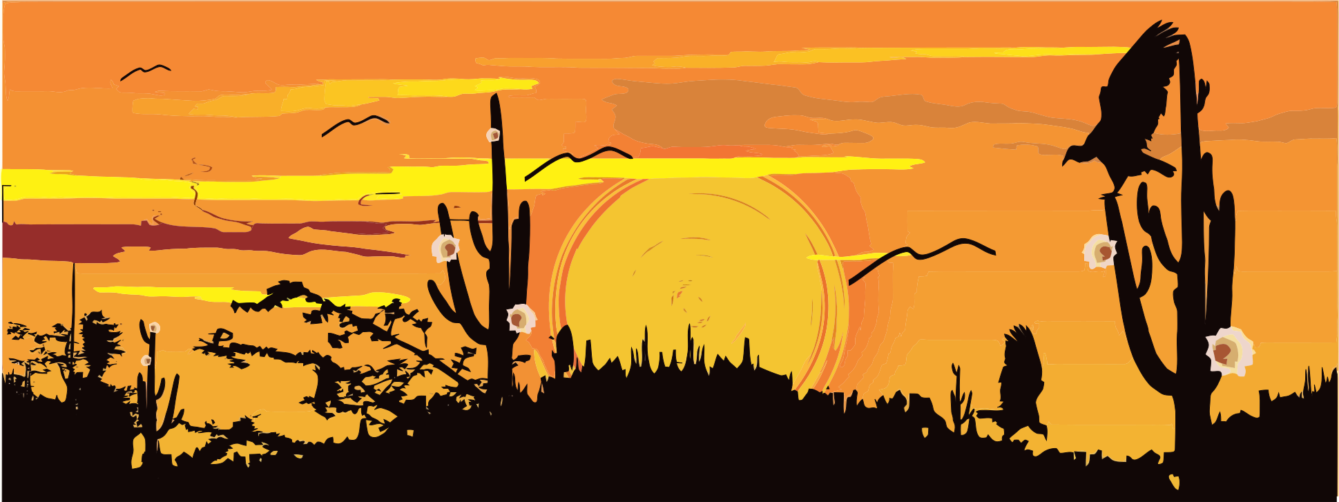 This captures a beautiful sunset in the desert, with the sun setting behind a cactus tree. There are several birds flying around the area, adding to the serene atmosphere of the scene. The sky is filled with orange hues, creating a warm and inviting ambiance. In total, there are five birds visible in the image, scattered throughout the sky at various heights and distances from each other. This picturesque moment showcases the beauty of nature and the tranquility of the desert landscape during sunset.
